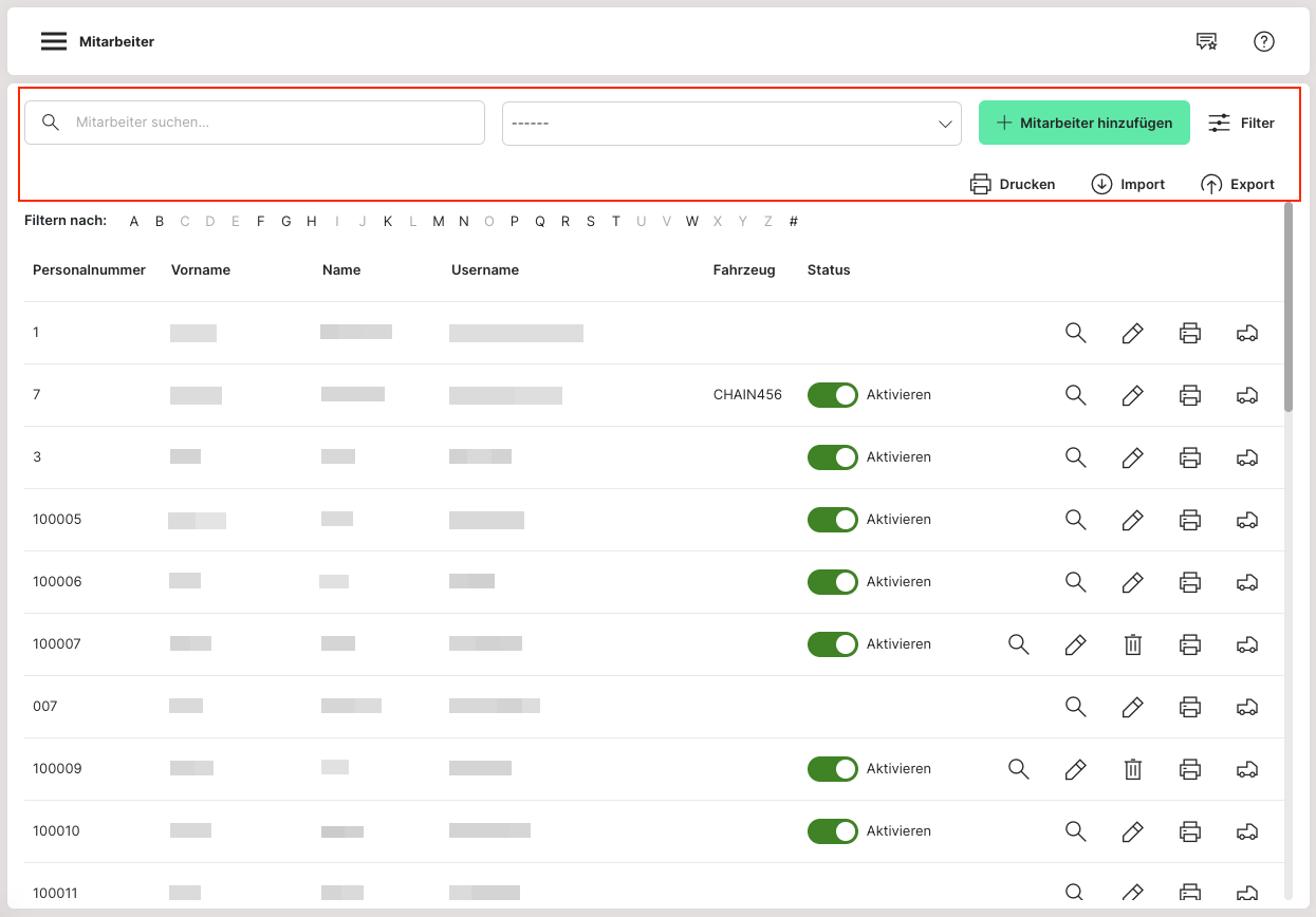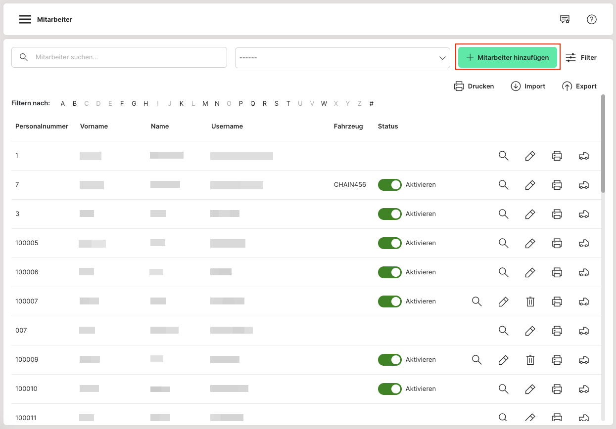 Die Barcodes können nach Einrichtung der Mitarbeiter in der Übersicht über den „Drucken“ Button einzeln ausgedruckt werden.