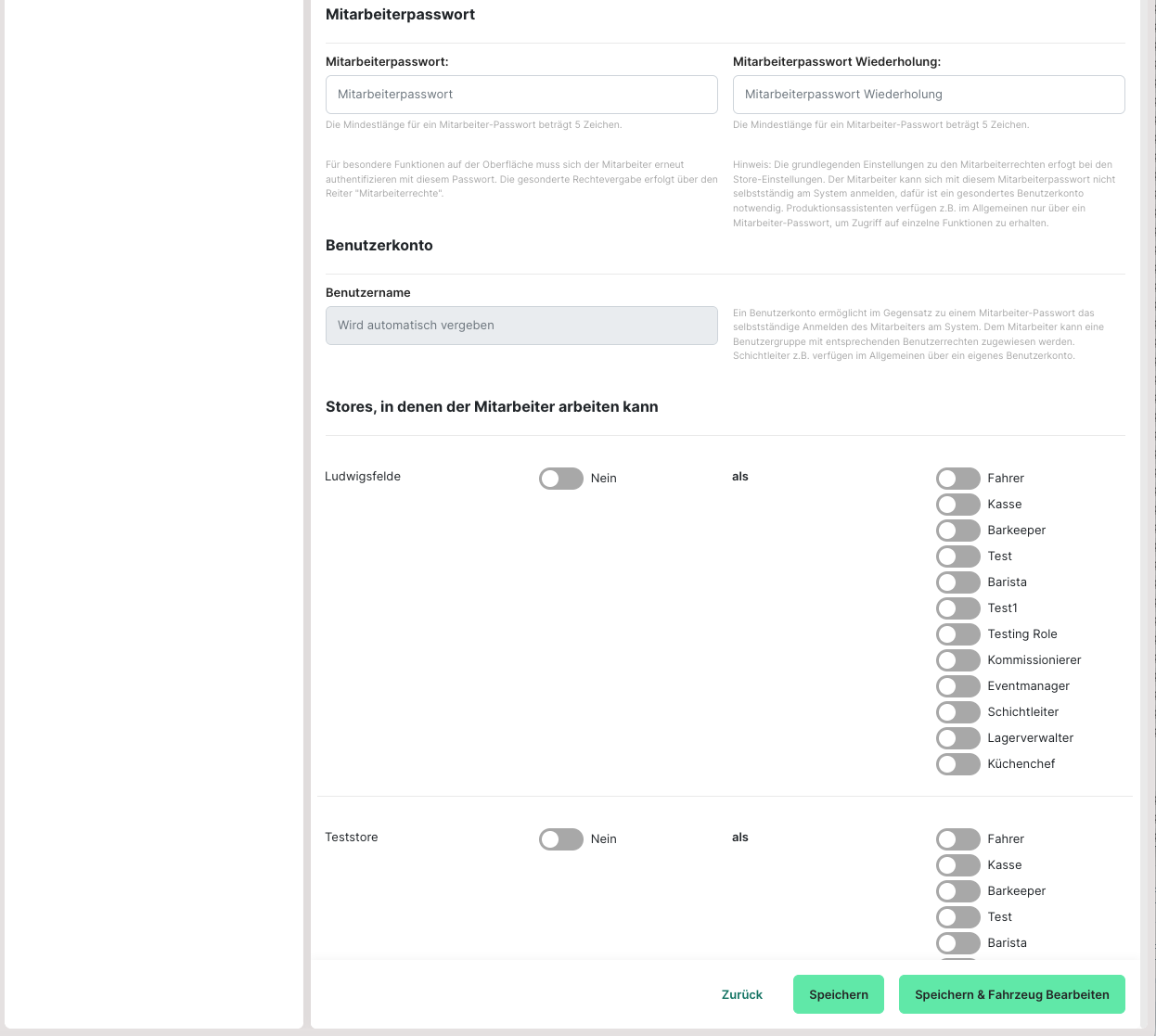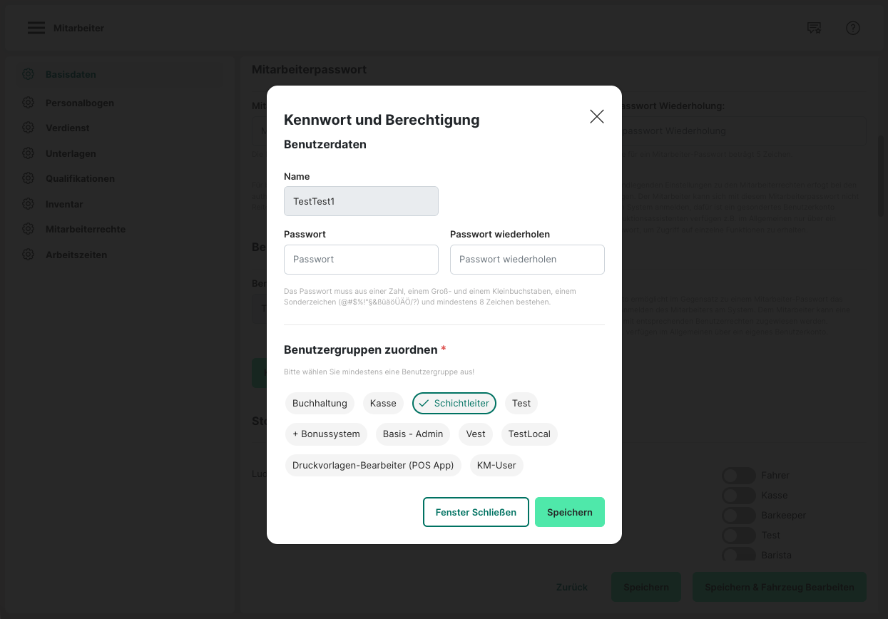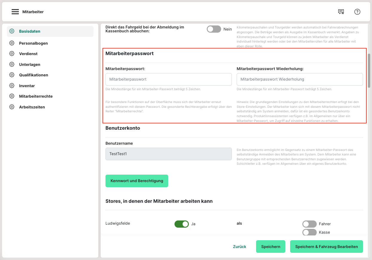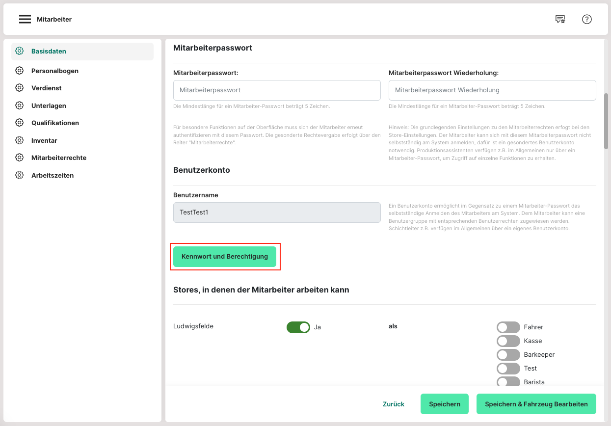 Um Mitarbeitern bestimmte Zugriffe zu geben oder zu verwehren, werden zuerst für den Store die Mitarbeiterrechte angelegt. Danach kann für den jeweiligen Mitarbeiter ein Passwort vergeben werden. Dazu wird ein Mitarbeiter angeklickt, um diesen zu bearbeiten. In den Basisdaten kann ein Passwort für den Mitarbeiter vergeben werden.