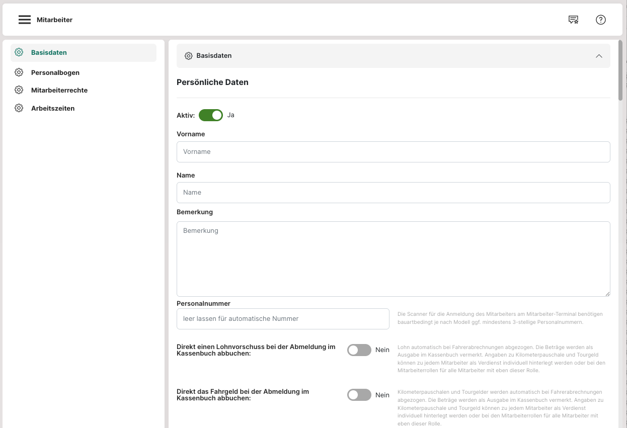 Innerhalb der Basisdaten wird z. B. der Vor- und Zuname des Mitarbeiters festgelegt, der überall im System angezeigt werden soll. Ebenso kann eine Personalnummer festgelegt werden. Sollte dieses Feld leer bleiben, wird die Nummer automatisch vergeben. Hierbei ist darauf zu achten, dass die Nummer mindestens 3-stellig sein sollte, um Fehler bei der Nutzung eines Scanners zu vermeiden.