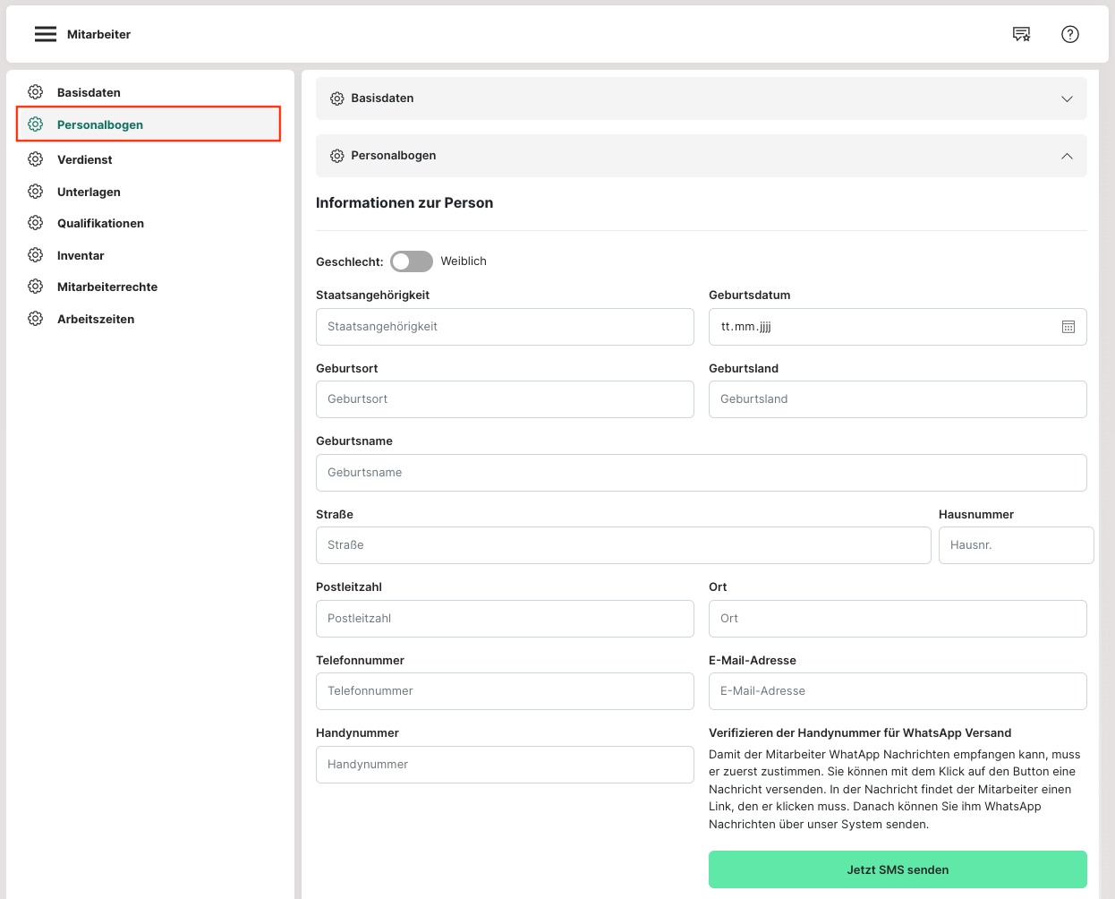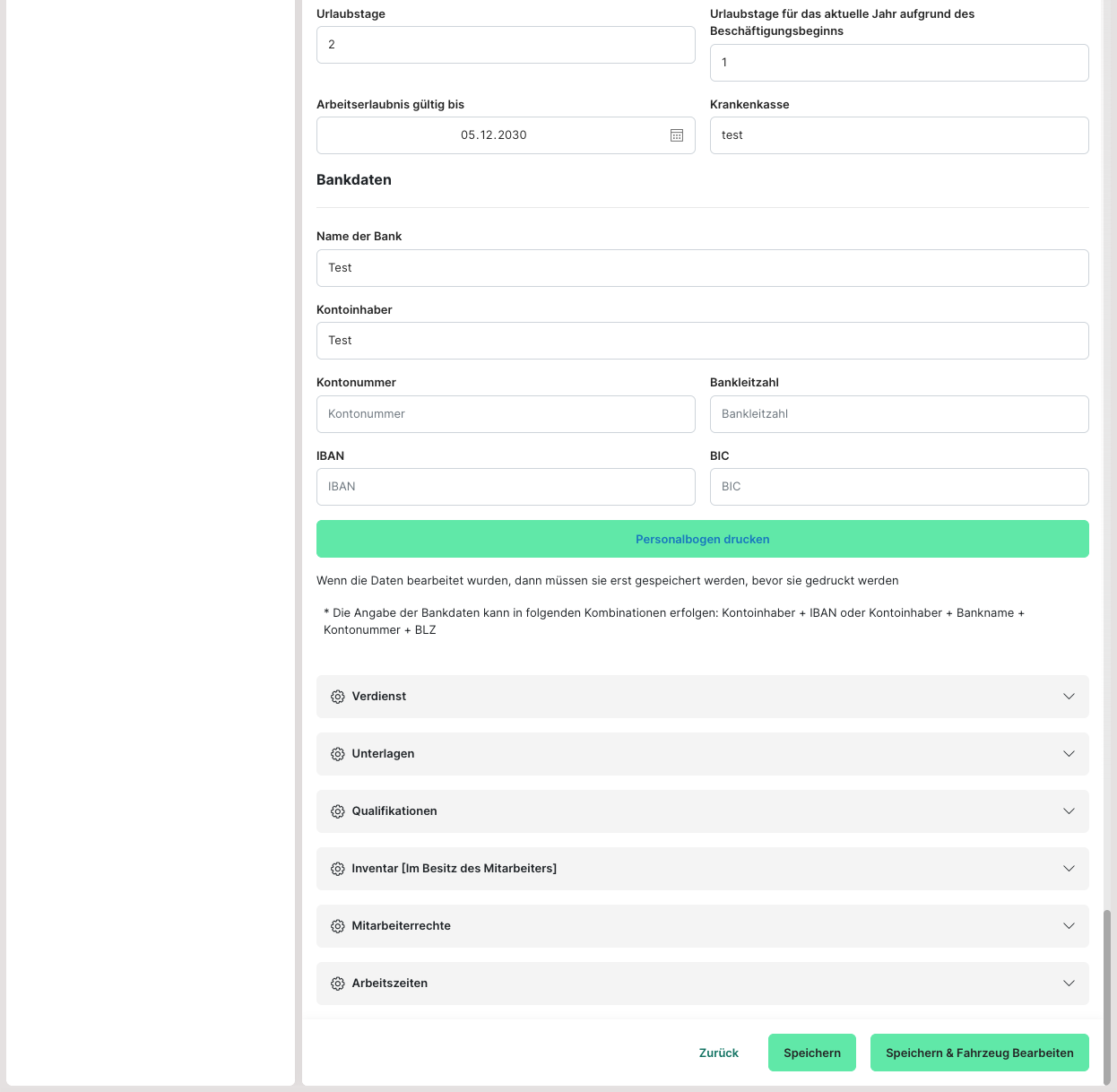 Der Personalbogen enthält alle relevanten Daten zum Mitarbeiter. Diese werden entweder schon beim Import anhand der Importvorlage ausgefüllt oder können hier händisch nachgetragen werden. Dadurch gibt es die Möglichkeit, alle Informationen zu den Mitarbeitern zentral zu verwalten. Der Personalbogen kann auch durch den grünen Button unter "Personalbogen drucken" direkt ausgedruckt werden.