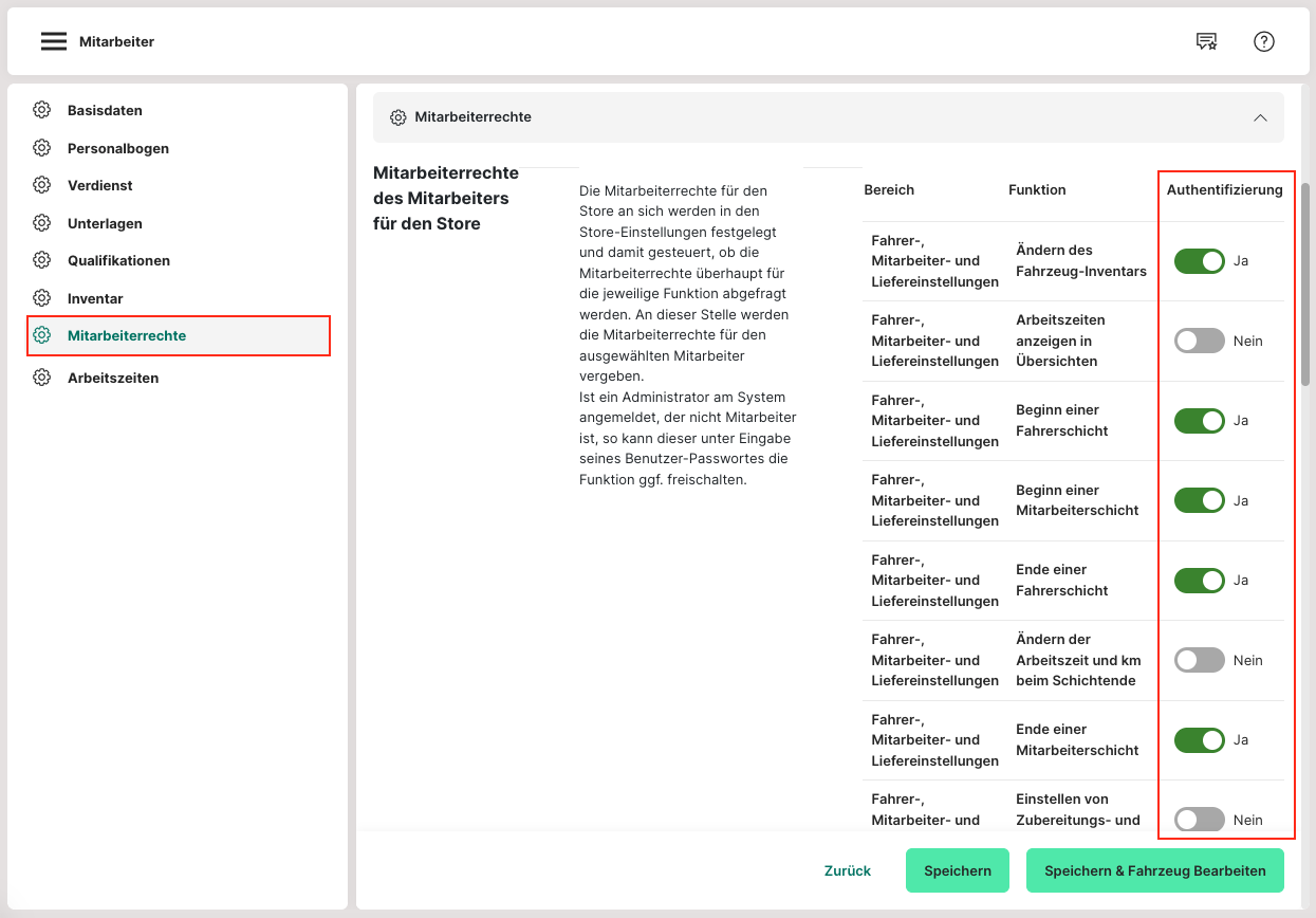 Im Anschluss wird auf den Tab „Mitarbeiterrechte“ geklickt. Dort kann nun festgelegt werden, auf welche Bereiche der Mitarbeiter Zugriff hat. Dazu wird der jeweilige Schalter in der Spalte "Authentifizierung" aktiviert.