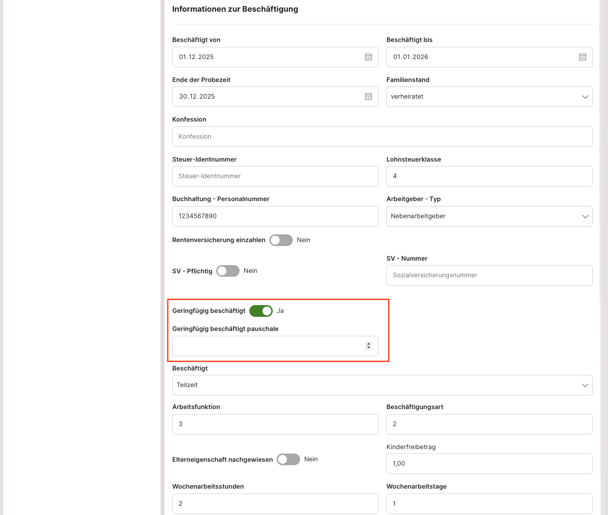 Hier werden steuerlich relevante Informationen erfasst, wie lange und seit wann ein Mitarbeiter angestellt ist, sowie Bank- und Krankenkassendaten. Es werden auch die Information für die Mitarbeiter hinterlegt, die als „geringfügig beschäftigt“ angestellt sind. Dazu wird der Button „geringfügig beschäftigt“ bestätigt und im Anschluss wird festgelegt, welche die maximale Pauschale in diesem Fall sein soll. Ist hier ein Wert hinterlegt, so wird im Fahrerterminal bei der Anmeldung des Mitarbeiters als auch im Tagesabschlussbericht ein Hinweis angezeigt, sobald der Mitarbeiter bei 80 % seines monatlichen Verdienstes angelangt ist.