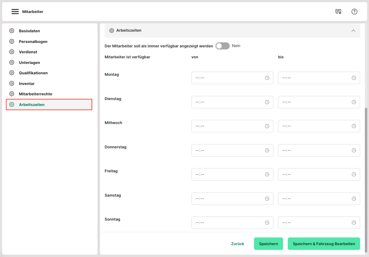 Nach dem Klick auf "Mitarbeiter hinzufügen" in der oberen Leiste, öffnet sich die Eingabemaske für die Einrichtung des Mitarbeiters.