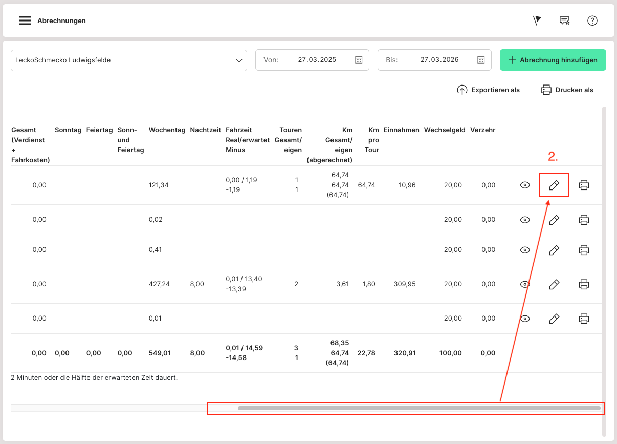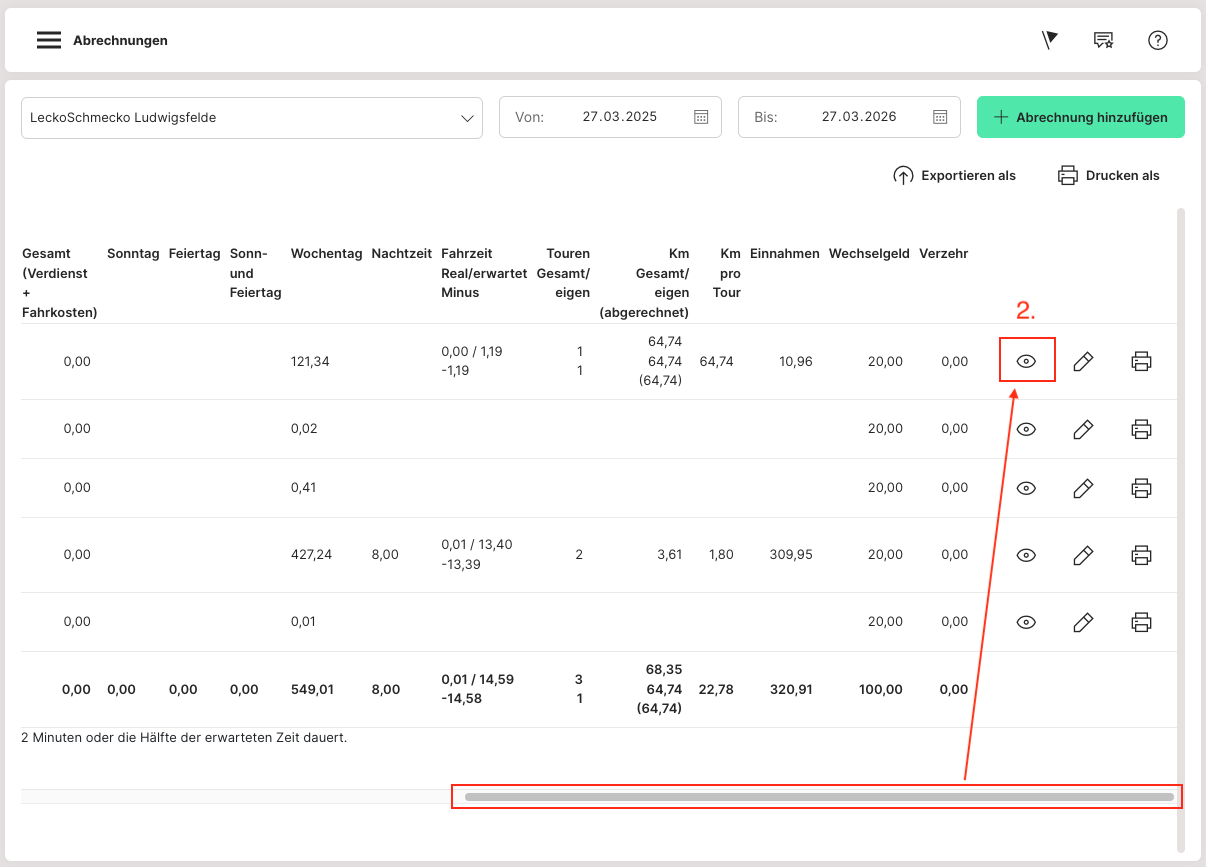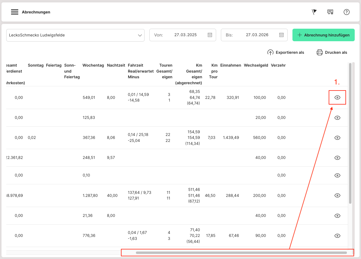 Danach wird auf das Augensymbol "Details" (1) hinter dem Mitarbeiter geklickt. Im Anschluss sind die gesamten Arbeitszeiten des Mitarbeiters über den definierten Zeitraum zu sehen.