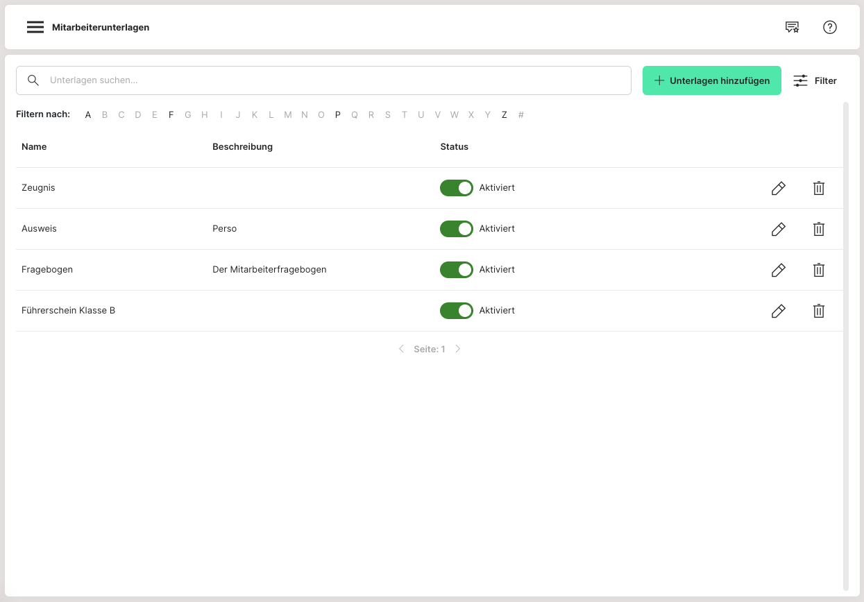 Sind die Unterlagen hier definiert worden, können diese anschließend innerhalb der Personalakte des einzelnen Mitarbeiters zugeordnet werden, unter Admin: Personal > Mitarbeiter.