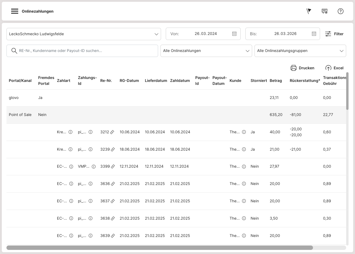 Im ersten Schritt wählst du den entsprechenden Zeitraum und ggf. den Store aus. Du bekommst dann eine Auflistung aller Online-Zahlungen als Liste. Du kannst diese Liste filtern, indem du die gewünschte Online-Zahlart im Dropdown auswählst. Wenn du in der Liste auf eine Online-Zahlart klickst, dann öffnet sich dieser Eintrag und zeigt die einzelnen Positionen an.