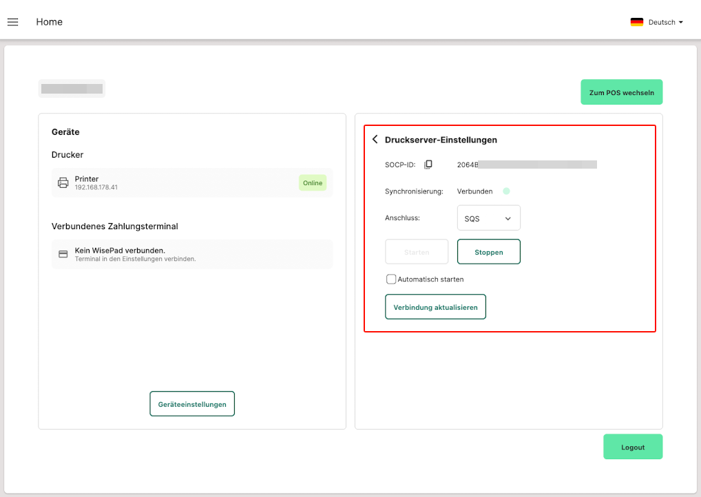 - Es muss der Anschluss "POS APP" (Admin: Hardware > Drucker) gewählt werden (optional SQS).