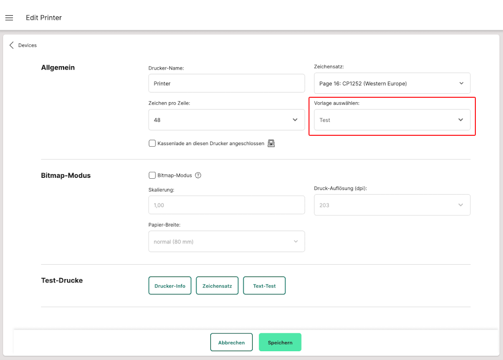 5. Wähle eine Vorlage aus. Führe bei Bedarf einen Testdruck aus unter "Test-Drucke", um die Verbindung zum Drucker zu verifizieren. Klicke anschließend auf "Speichern".
