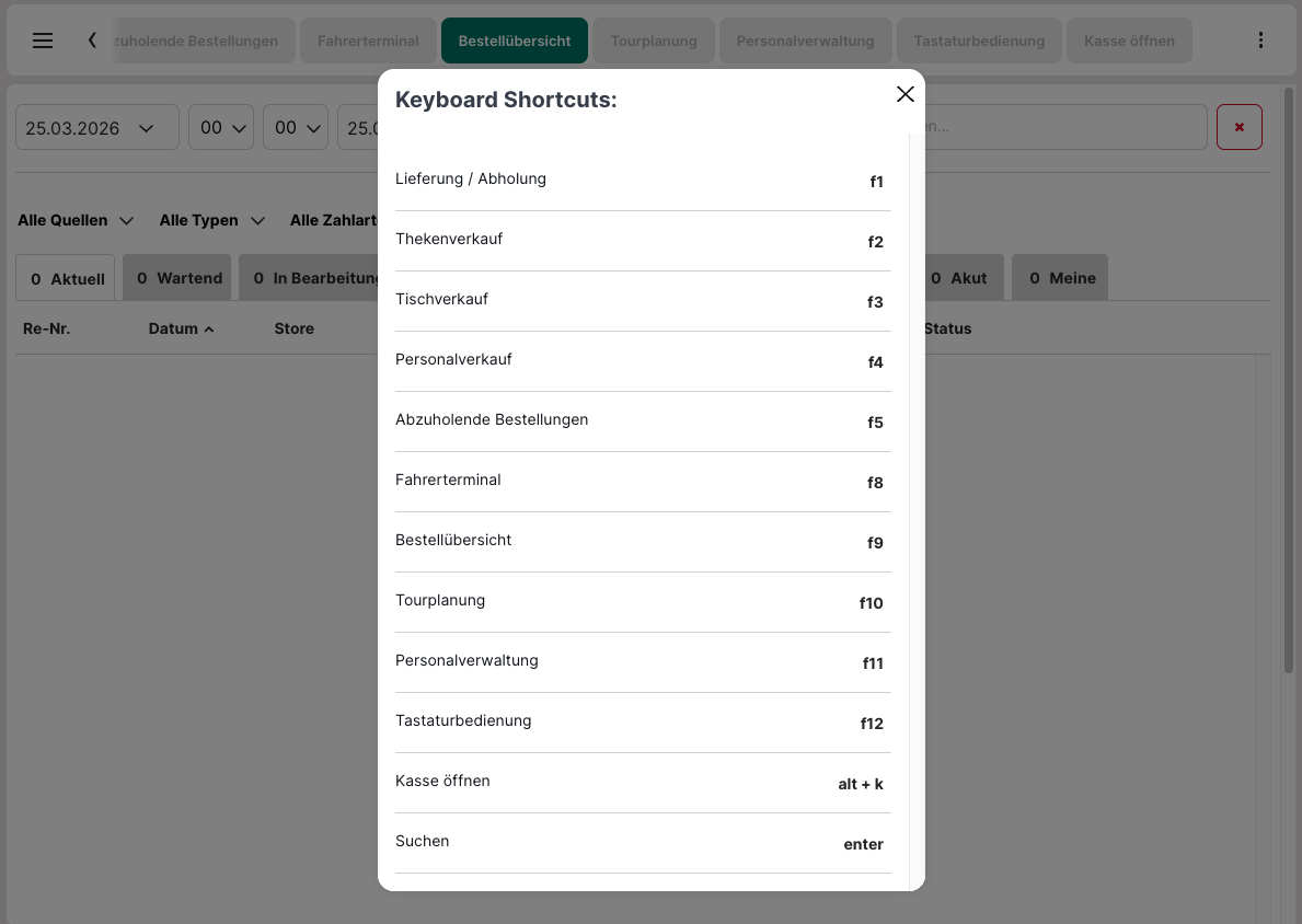 Die Informationen für die Steuerung des Systems über eine Tastatur durch Tasten-Kürzel (Keyboard Shortcuts) findet man bei "Bestellübersicht" (oder bei jedem Reiter bei dem man den folgenden Reiter sieht) über den Reiter "Tastaturbedienung" oder die "F12" Taste auf der Tastatur .