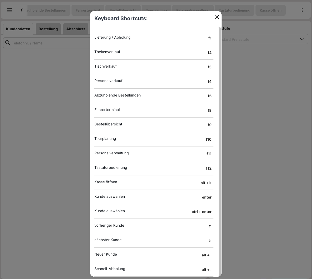 Die angezeigten Tastaturkürzel bei "Tastaturbedienung" hängen teilweise davon ab, in welcher Ansicht man sich befindet. Neben den angezeigten Kürzeln wenn man sich in der "Bestellübersicht" befindet, werden noch mehr/andere Kürzel angezeigt, wenn man sich bei "Lieferung / Abholung" beim Abschnitt "Kundendaten" befindet und noch keinen Kunden ausgewählt hat, wieder andere bei "Lieferung / Abholung" beim Abschnitt "Kundendaten" wenn man den Kunden schon ausgewählt hat, wieder andere bei "Lieferung / Abholung" beim Abschnitt "Bestellung" (also beim Auswählen der Artikel für den Warenkorb) und nochmal andere bei "Lieferung / Abholung" beim Abschnitt "Abschluss".