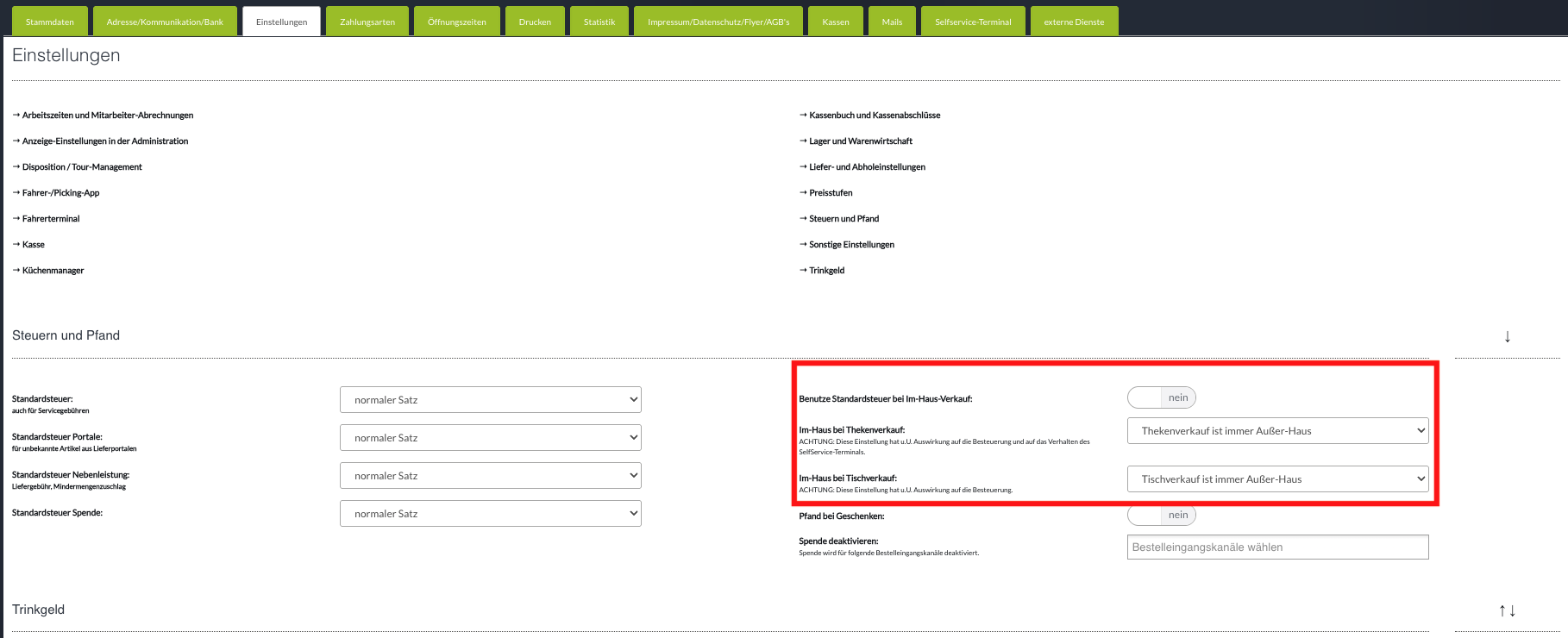 Diese Einstellungen steuern, wie Im-Haus- und Außer-Haus-Verkäufe steuerlich behandelt werden. Nur mit der oben genannten Konfiguration wird der reduzierte Steuersatz für Speisen ab dem 01.01.2026 korrekt angewendet.