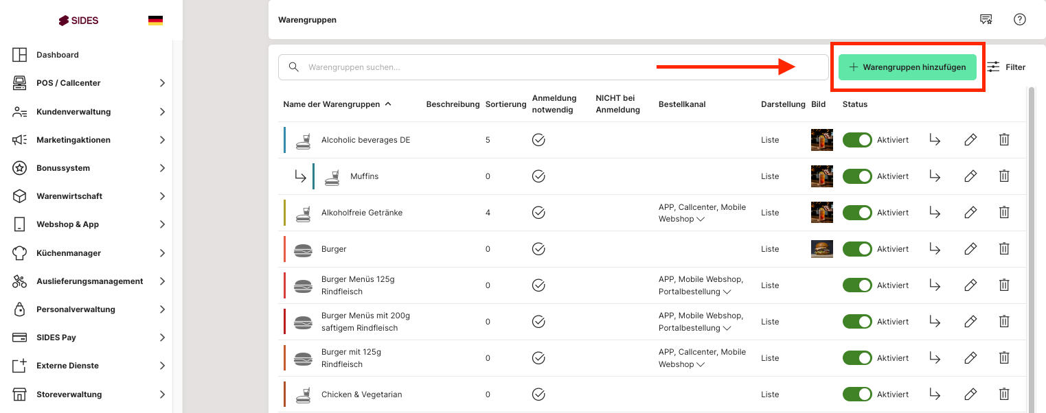 Warengruppen sind Zusammenfassungen, in der einzelne Verkaufsartikel, z. B. Pasta, Pizza, Burger, Getränke – ähnlich einer Rubrik, gegliedert werden.