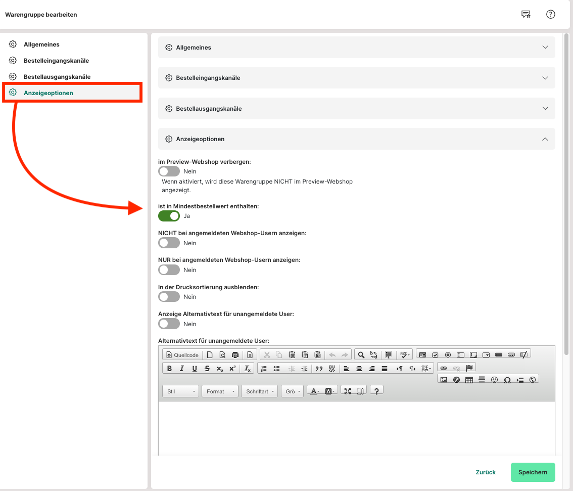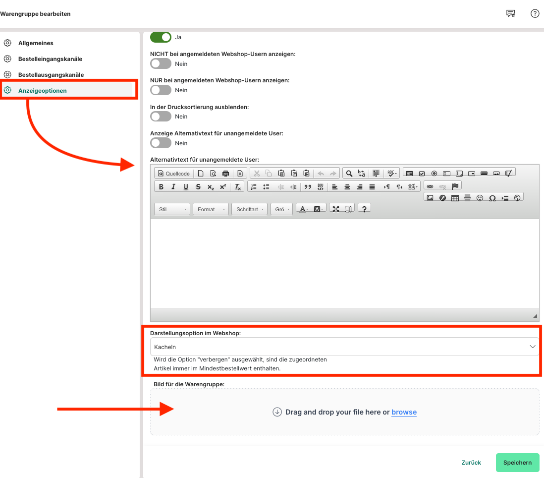 wird festgelegt, wo die Warengruppe angezeigt werden soll. Wenn die