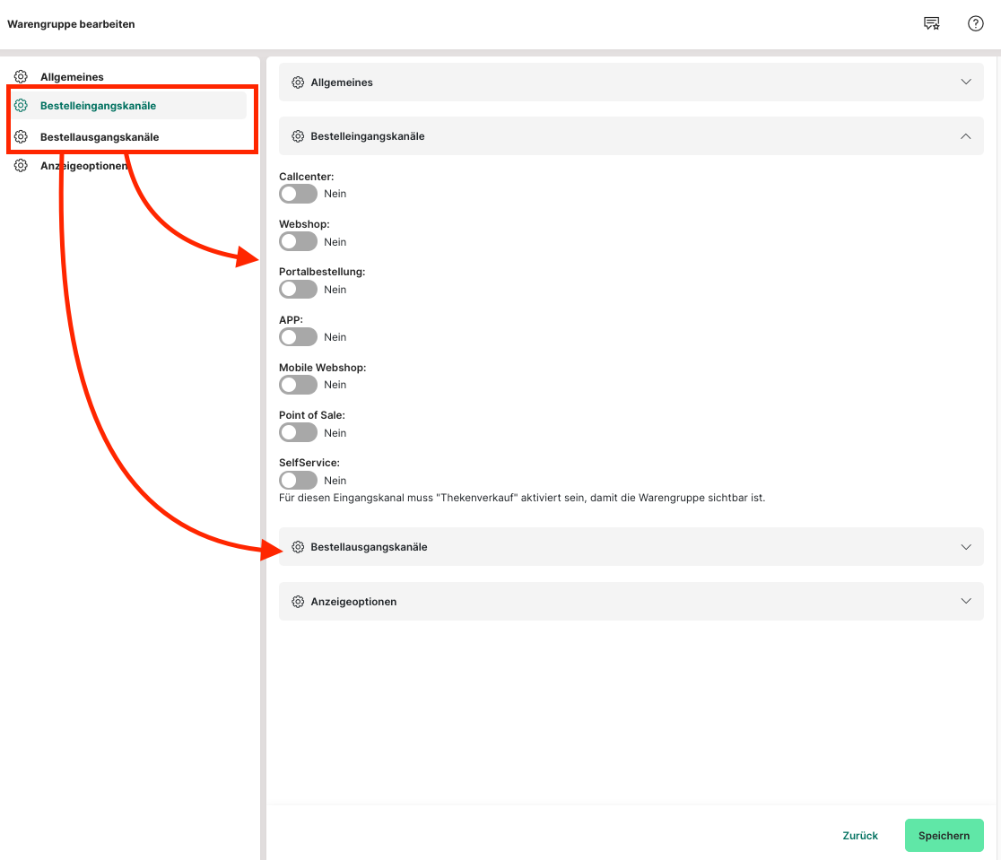 Unter "Bestelleingangskanäle" und "Bestellausgangskanäle"