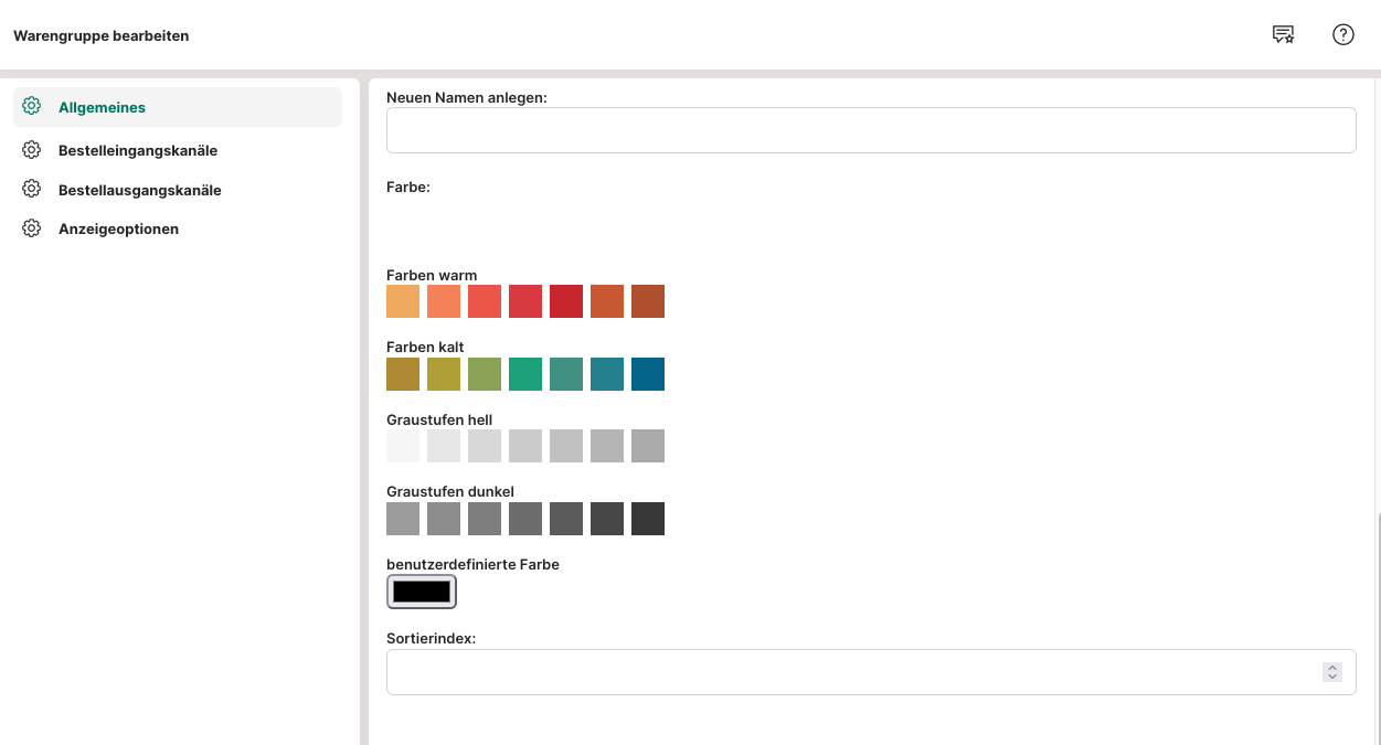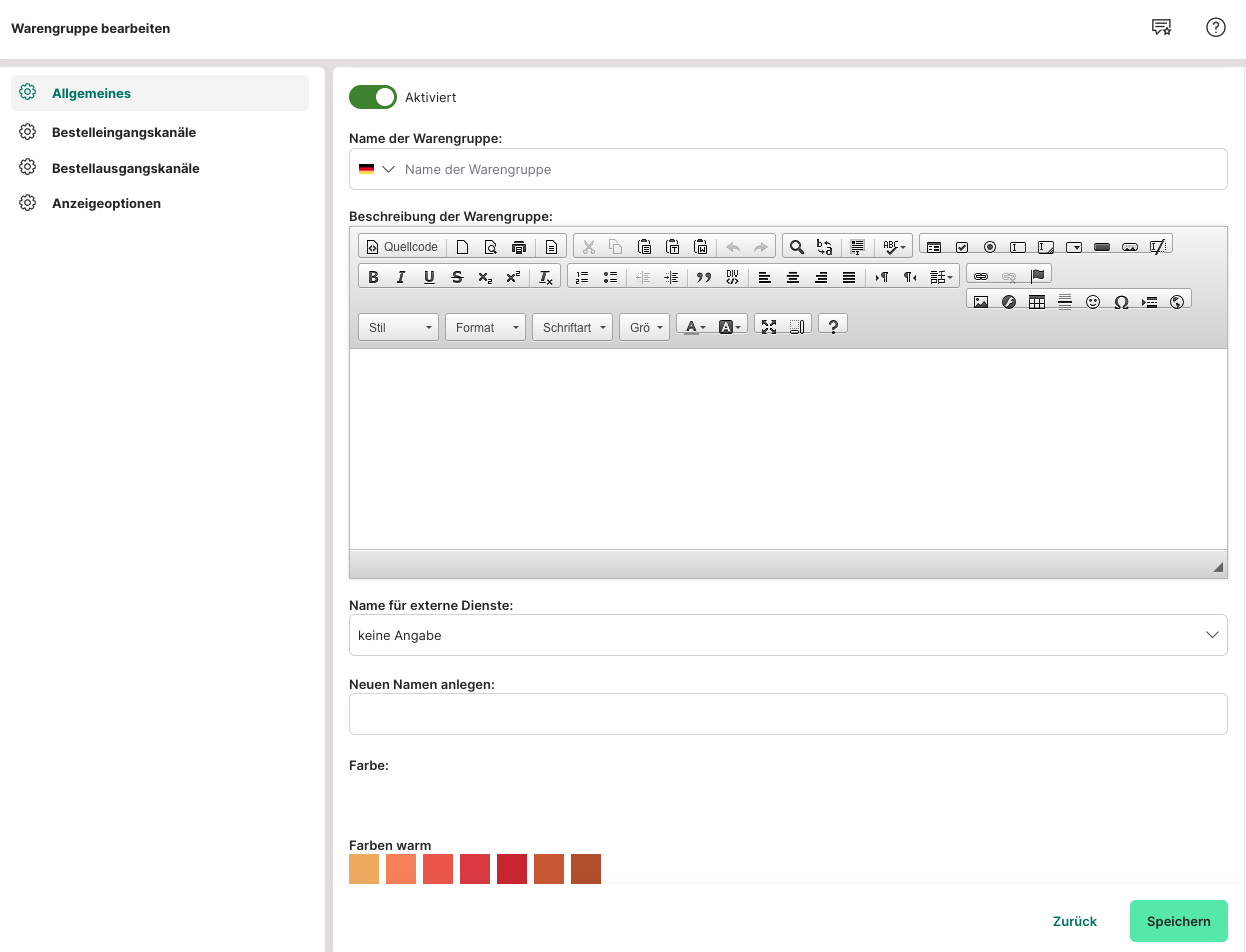 Um eine neue Warengruppe anzulegen, wird auf den dunkelgrünen Button "Warengruppe hinzufügen" geklickt - dadurch öffnet sich die Eingabemaske. Als Erstes wird der neuen Warengruppe ein Name vergeben. Als Nächstes kann zur besseren Kennzeichnung die erwähnte Farbe zugeordnet werden .