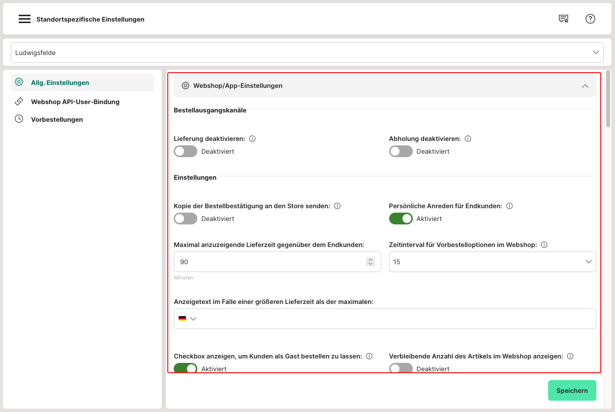 Admin: Webshop & App > Standortspezifische Einstellungen > Allgemeine Einstellungen. |