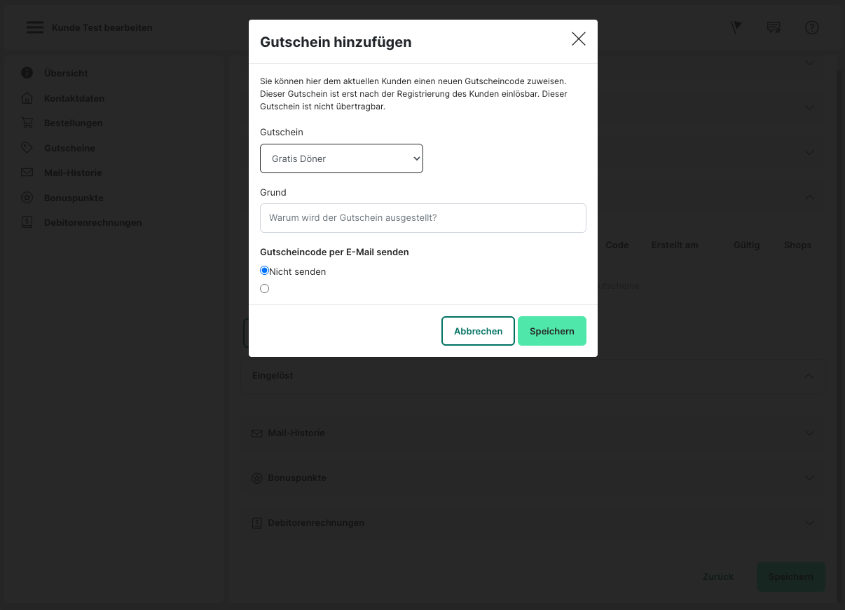 Gutscheine kannst du aus dem System an den Kunden vergeben und sogar via Mail versenden, sofern dieser eine Mailadresse angegeben hat.