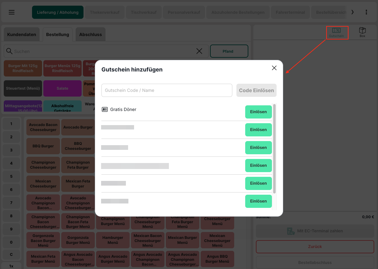 Wird der Kunde mit seinem Kundenkonto nun in der Kasse aufgerufen, blinkt das Gutscheinfeld in der Kasse auf der rechten Seite. Dies ist ein Zeichen, dass der Kunde einen persönlichen Gutschein im Konto hinterlegt hat.
