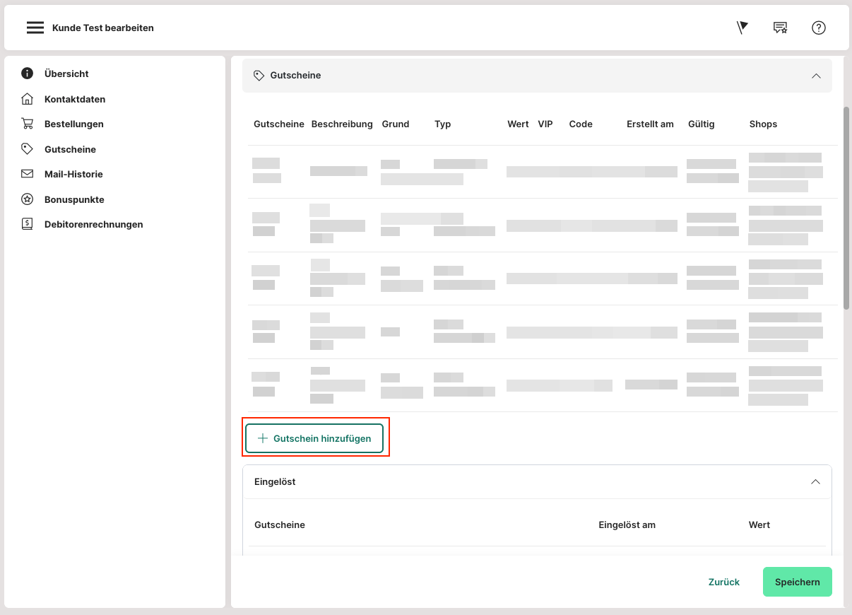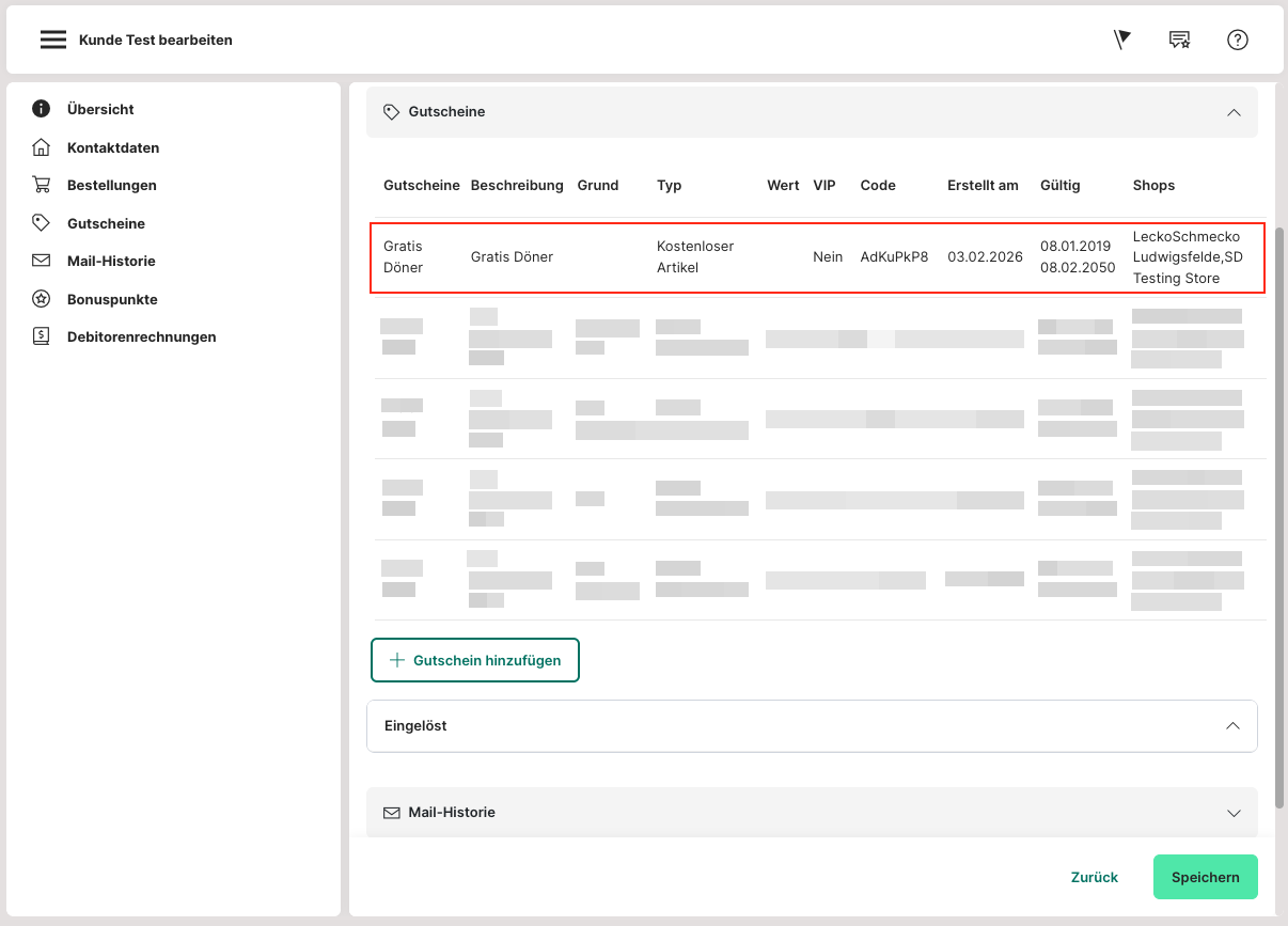 Ist der Gutschein durch den Klick auf "Speichern" korrekt hinterlegt, siehst du hier Folgendes: