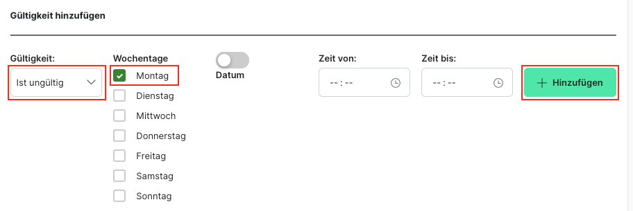 Gültigkeit hinzufügen/Einstellungen