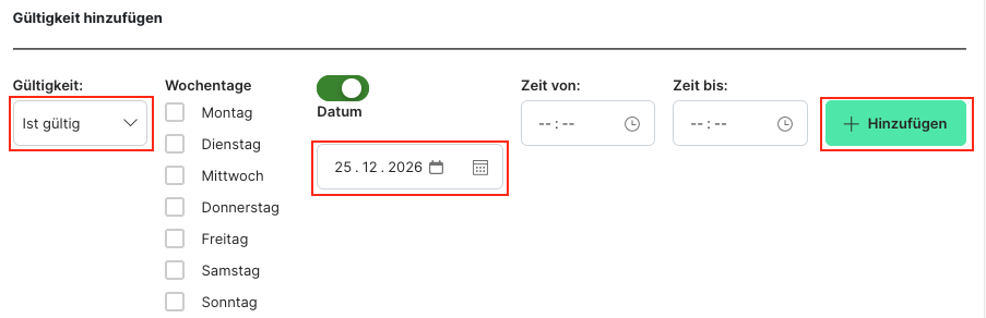 - Sobald mindestens eine "Gültig"-Regel existiert (z. B. "Gültig am 25.12."), wird der Artikel für alle anderen Zeiträume automatisch ungültig.