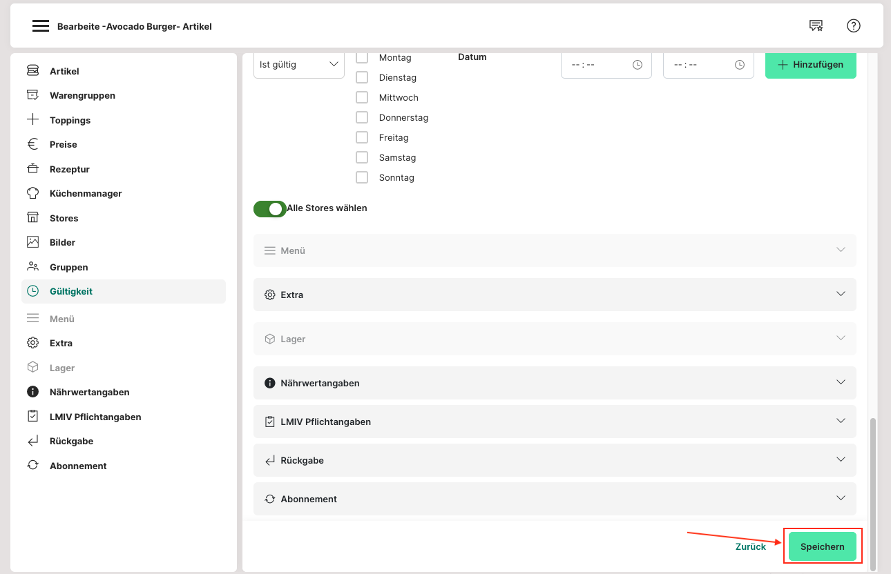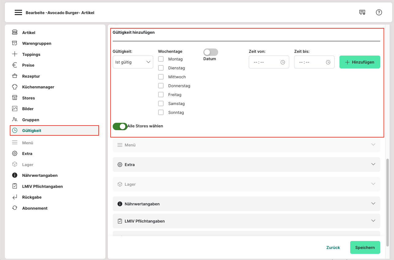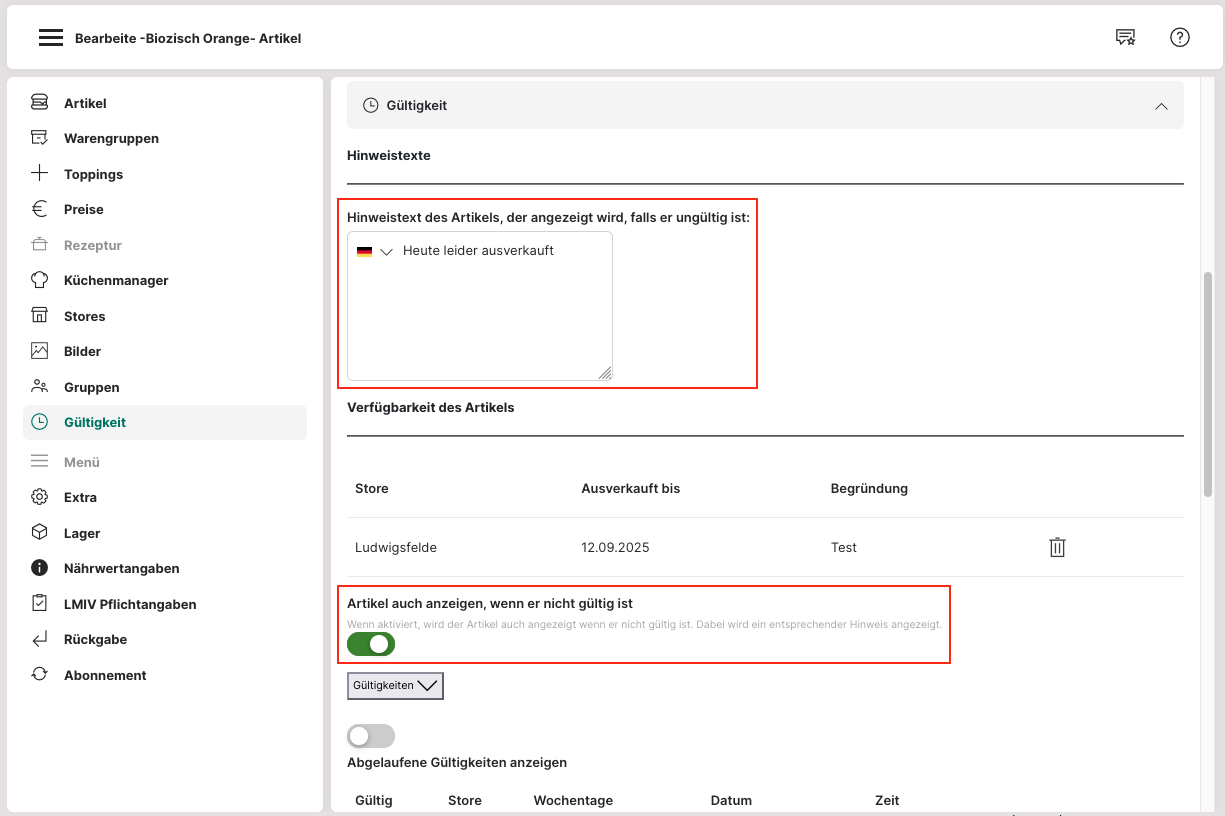 gezielt zu sperren (z. B. Mittagstisch nicht am Wochenende). Wo Admin: Artikelverwaltung > Artikel > Bearbeiten > Abschnitt "Gültigkeit".