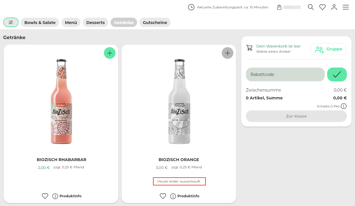 Beispiel für den Hinweistext im Webshop (Artikel ist ausgegraut und nicht bestellbar):