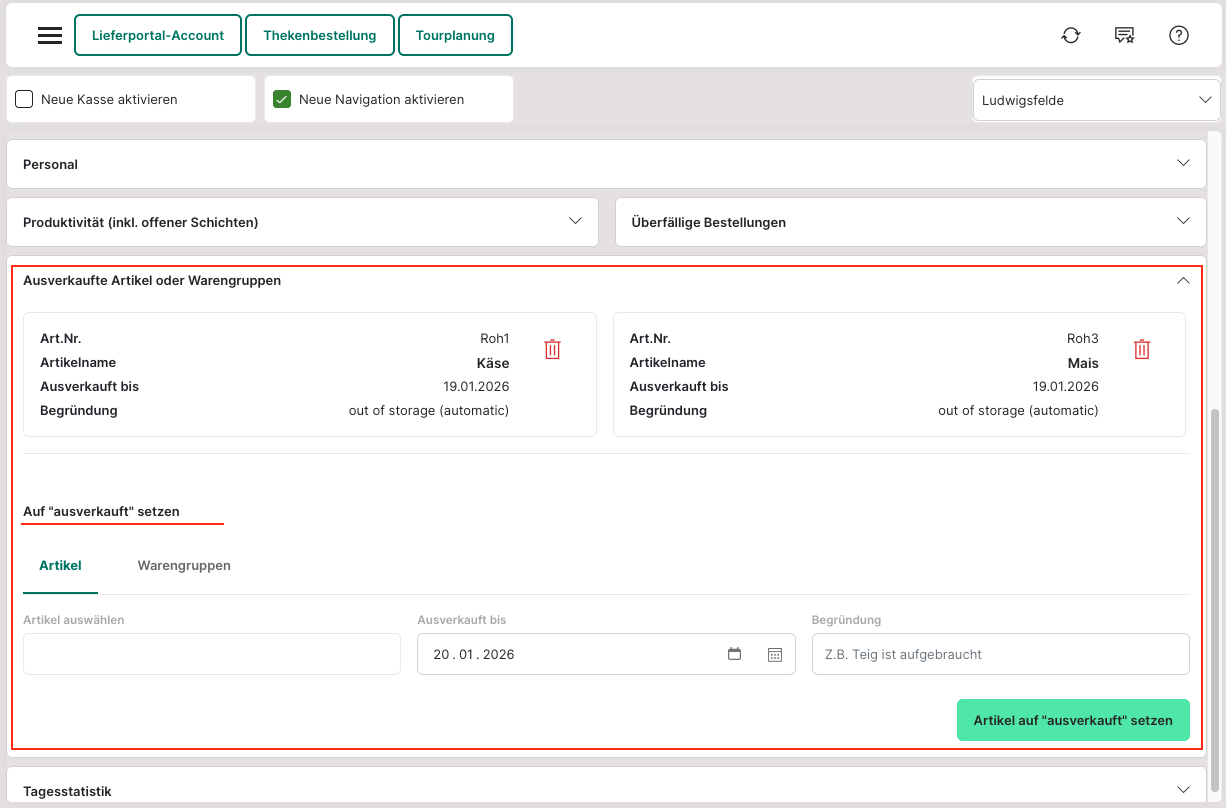 Oberhalb des Eingabebereichs wird eine Übersicht der aktuell als ausverkauft markierten Artikel oder Warengruppen angezeigt. Einzelne Einträge können jederzeit über das Papierkorbsymbol entfernt werden, wodurch der Artikel sofort wieder verfügbar ist.