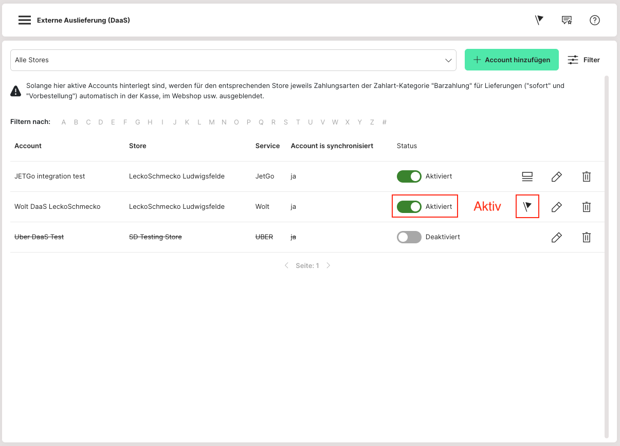 Wenn aktive DaaS-Konten erstellt werden, werden die Barzahlungsmethoden für Lieferungen automatisch für den Store deaktiviert.