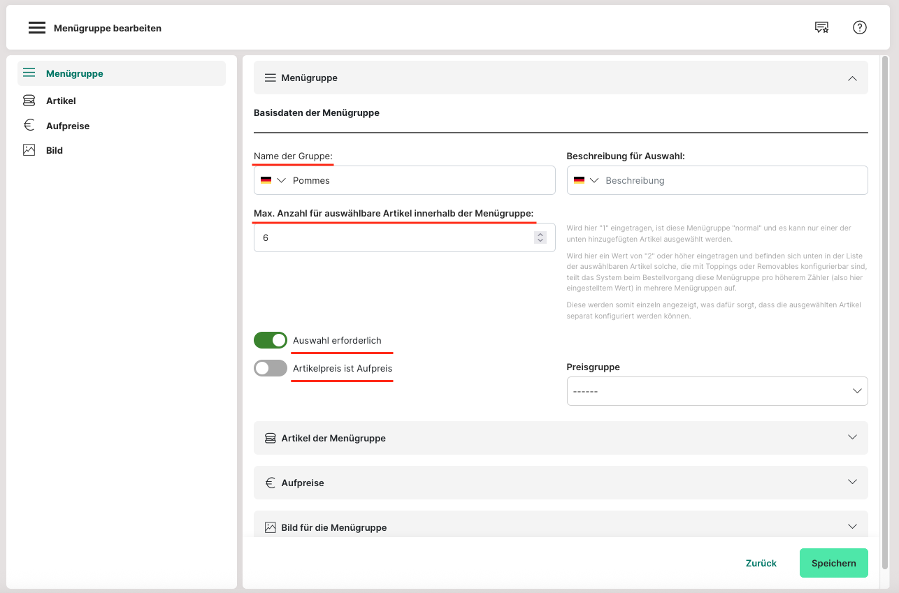 Weitere Informationen zur maximalen Anzahl auswählbarer Artikel innerhalb einer Menügruppe ist hier zu finden.