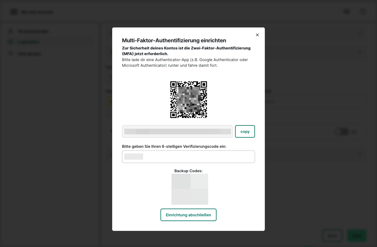 - Nach Eingabe des letzten Backup-Codes wirst du automatisch zur 2FA-Einrichtungsseite geleitet.