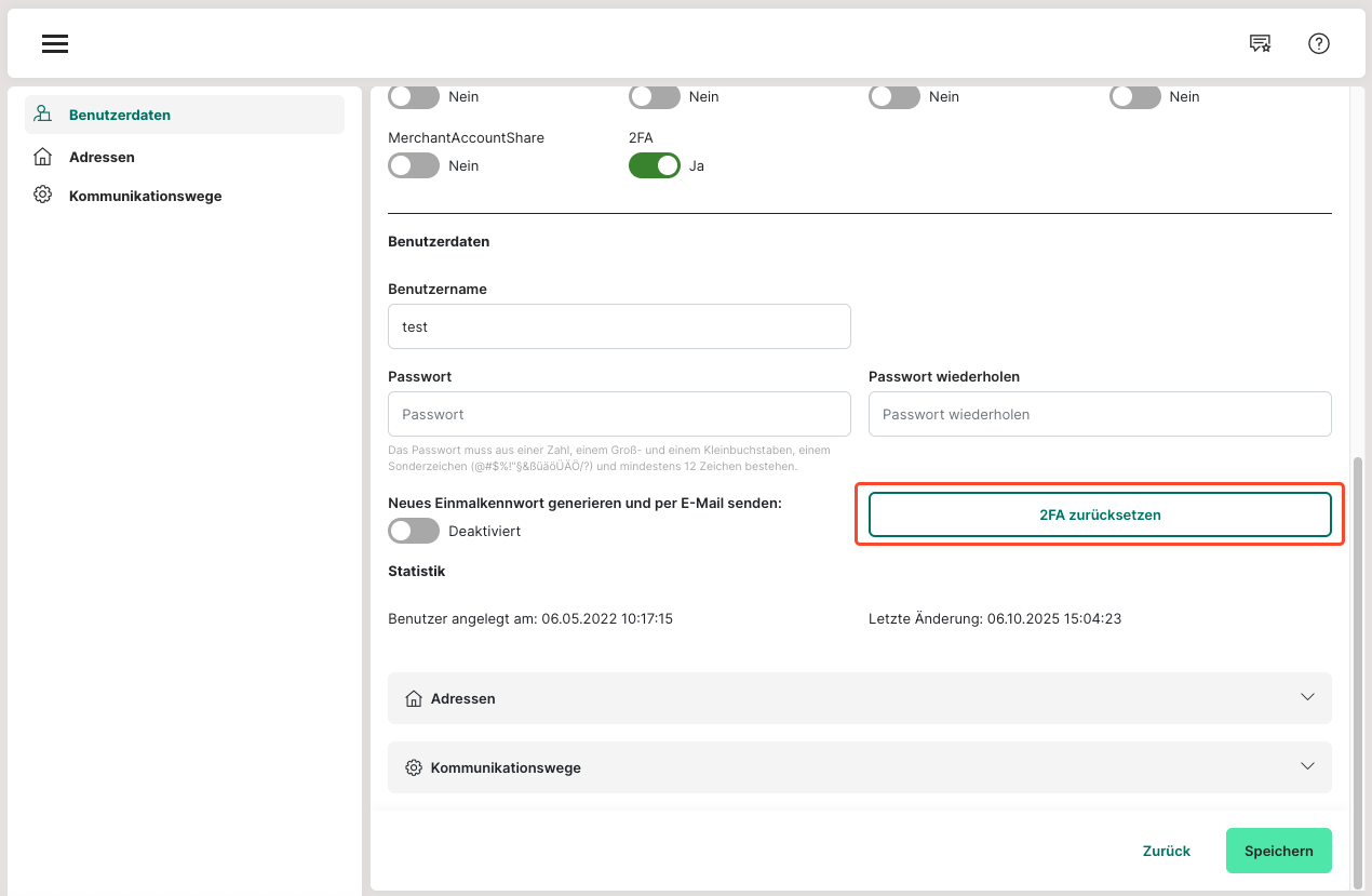 Sollte ein Benutzer weder Zugriff auf seinen Authentifikator noch Backup-Codes haben, kann man in der Benutzerverwaltung die 2FA für diesen Benutzer zurücksetzen. Der Benutzer wird bei der nächsten Anmeldung aufgefordert, die 2FA neu einzurichten.