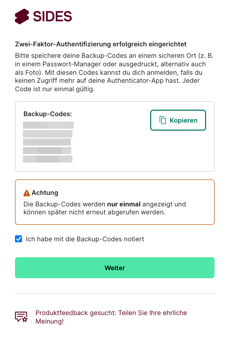 - Aktiviere die Checkbox "Ich habe die Backup-Codes notiert" und klicke auf "Weiter".