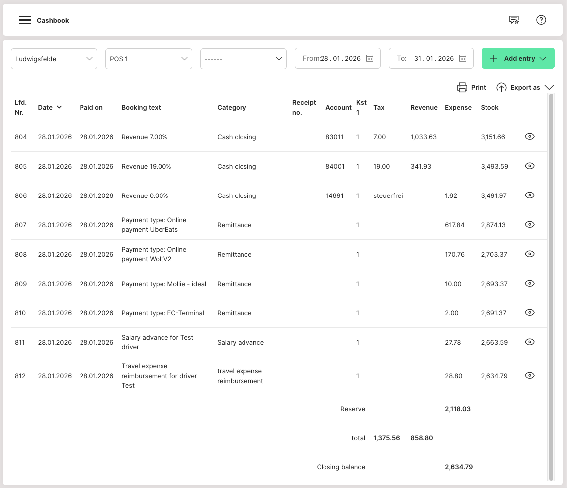 You can search for a desired time period in the cashbook, and this time period can be exported or printed out.