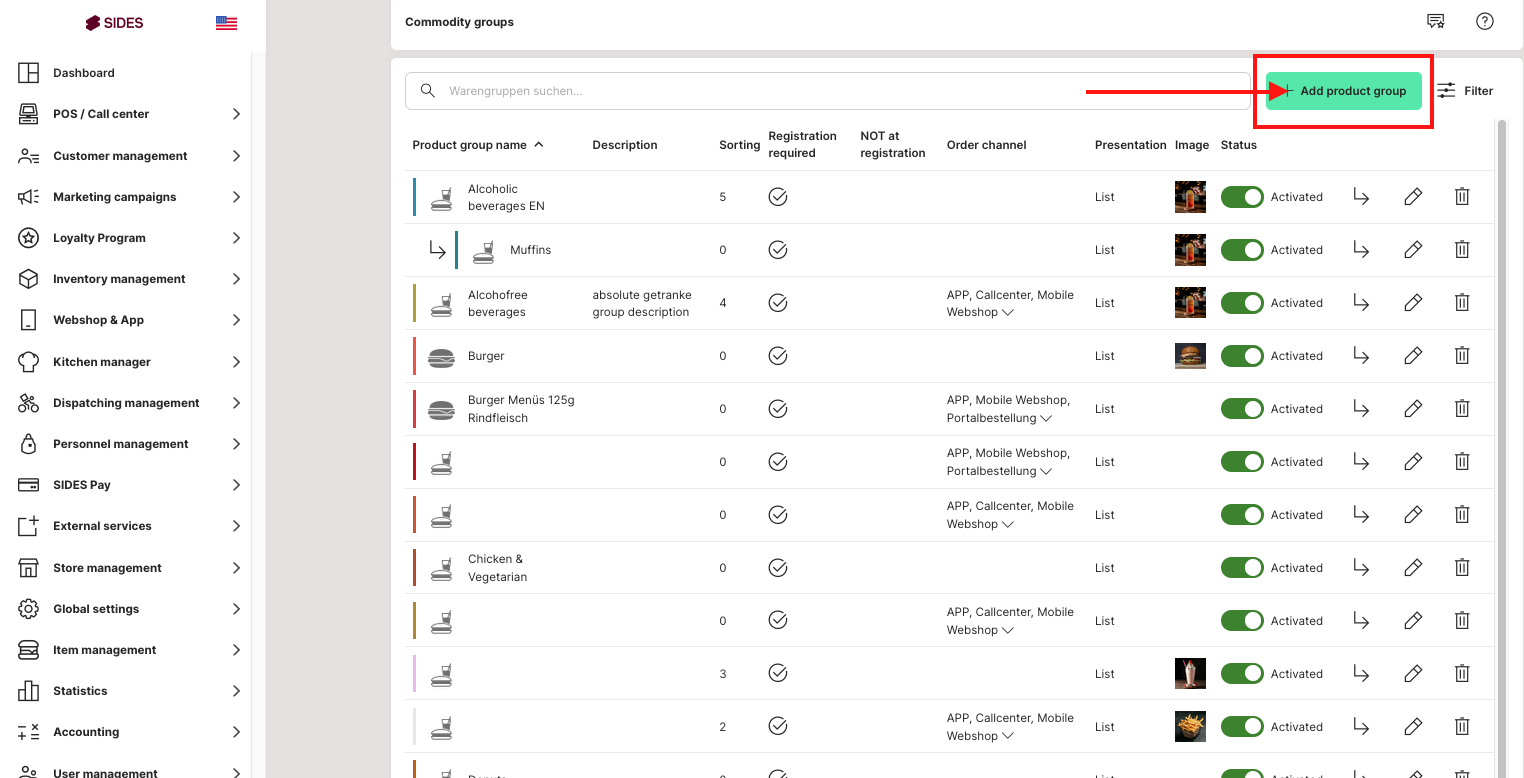 The product group list is basically structured like any other list in our system. There are the usual buttons for "Display", "Edit", "Deactivate/activate" and "Delete". Another button "Add sub group" is also available if a commodity group is to be further subdivided for the webshop and app, e.g. for the commodity group "Drinks" there should be further subdivisions with "Alcoholic drinks" and "Non-alcoholic drinks".