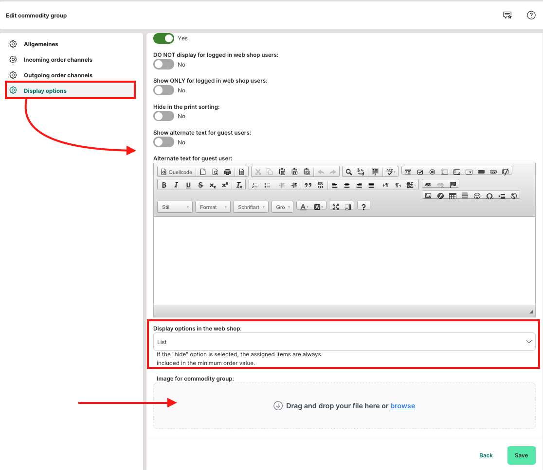 Furthermore, depending on the setting when creating the commodity group, the incoming and outgoing order channels for which the commodity groups should be visible are also displayed. The images stored for the commodity group are also displayed.