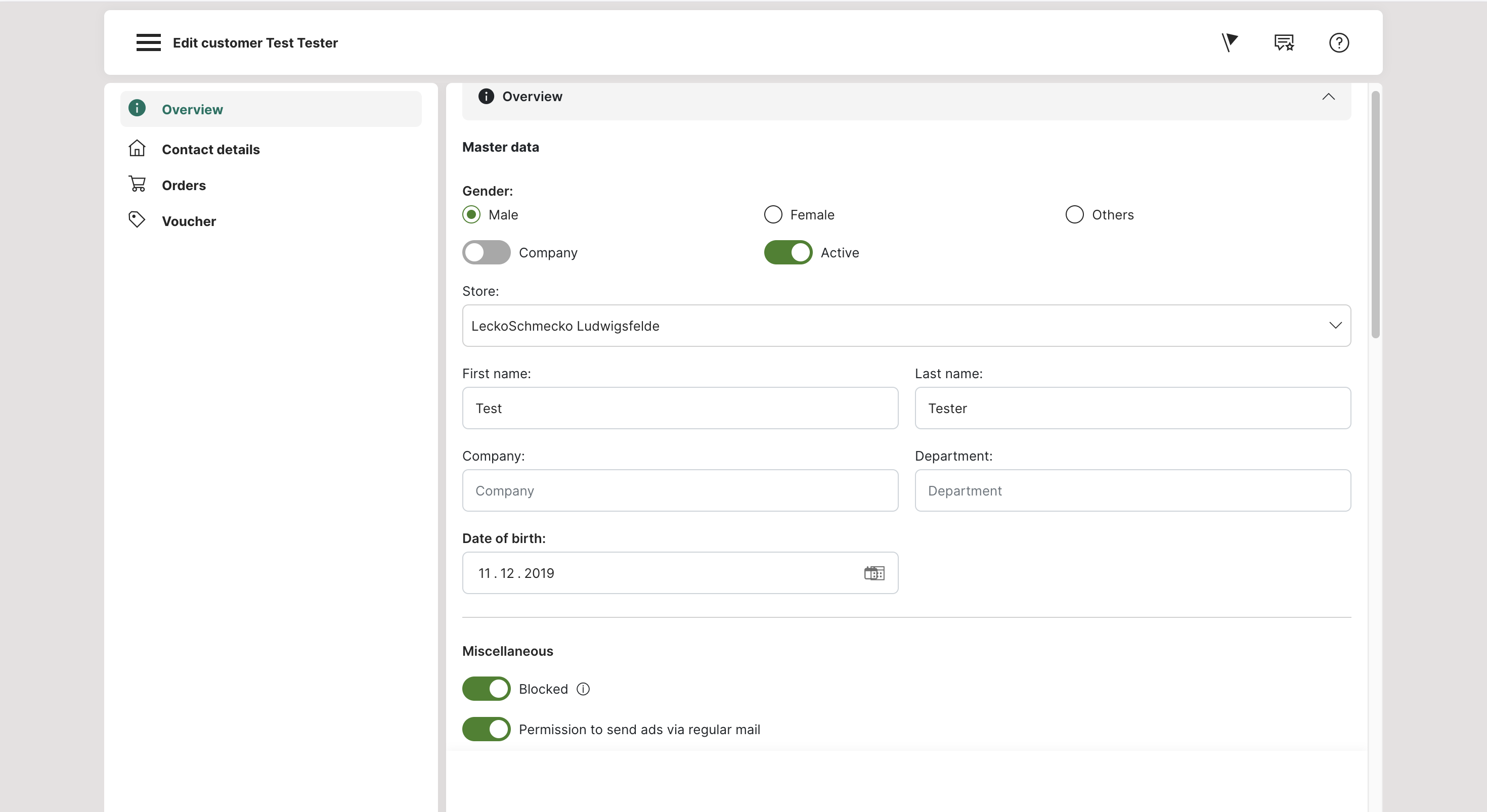 Within the data of a customer you will also find the corresponding function for blocking a customer. If this function is activated, all orders of the customer will be rejected.