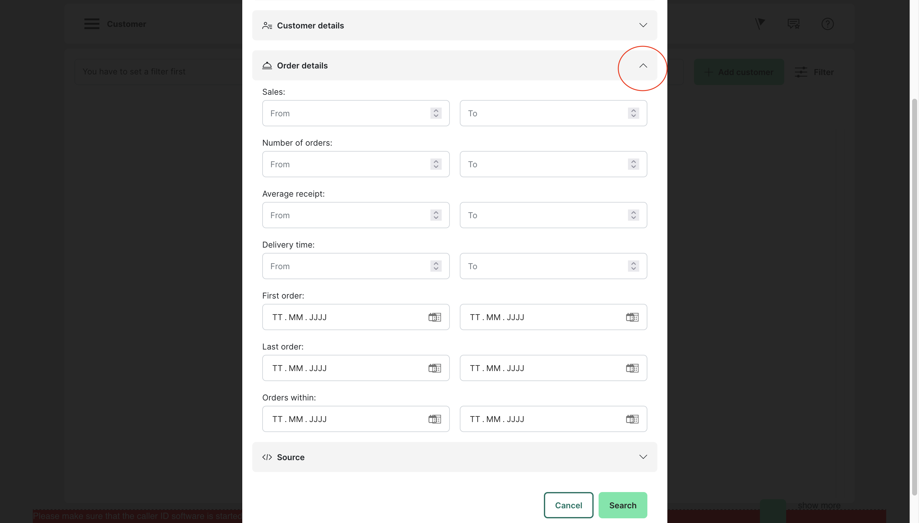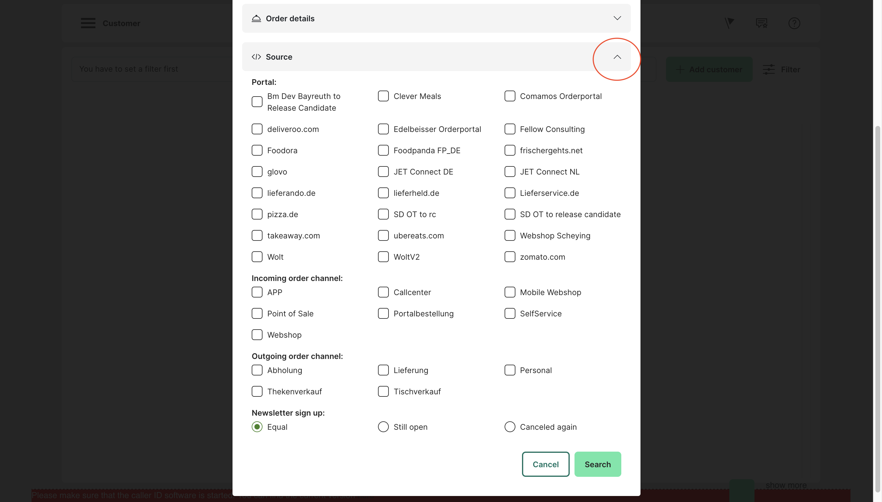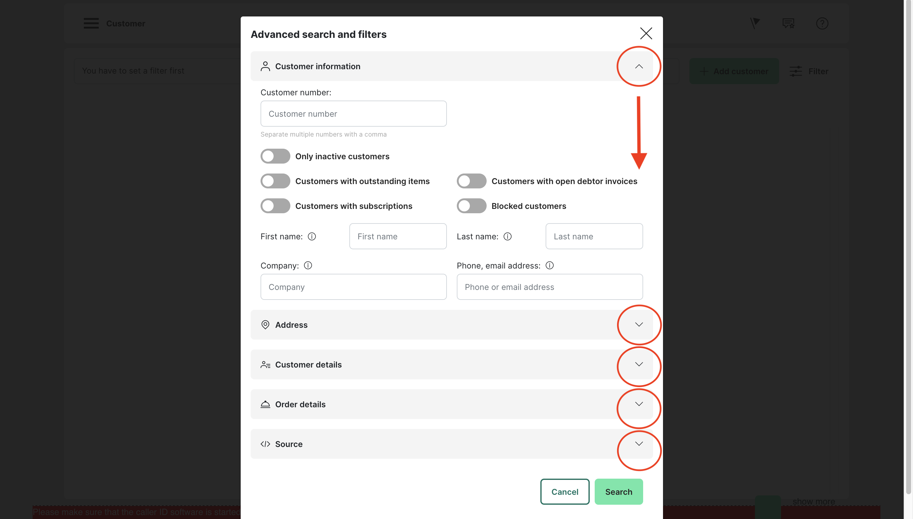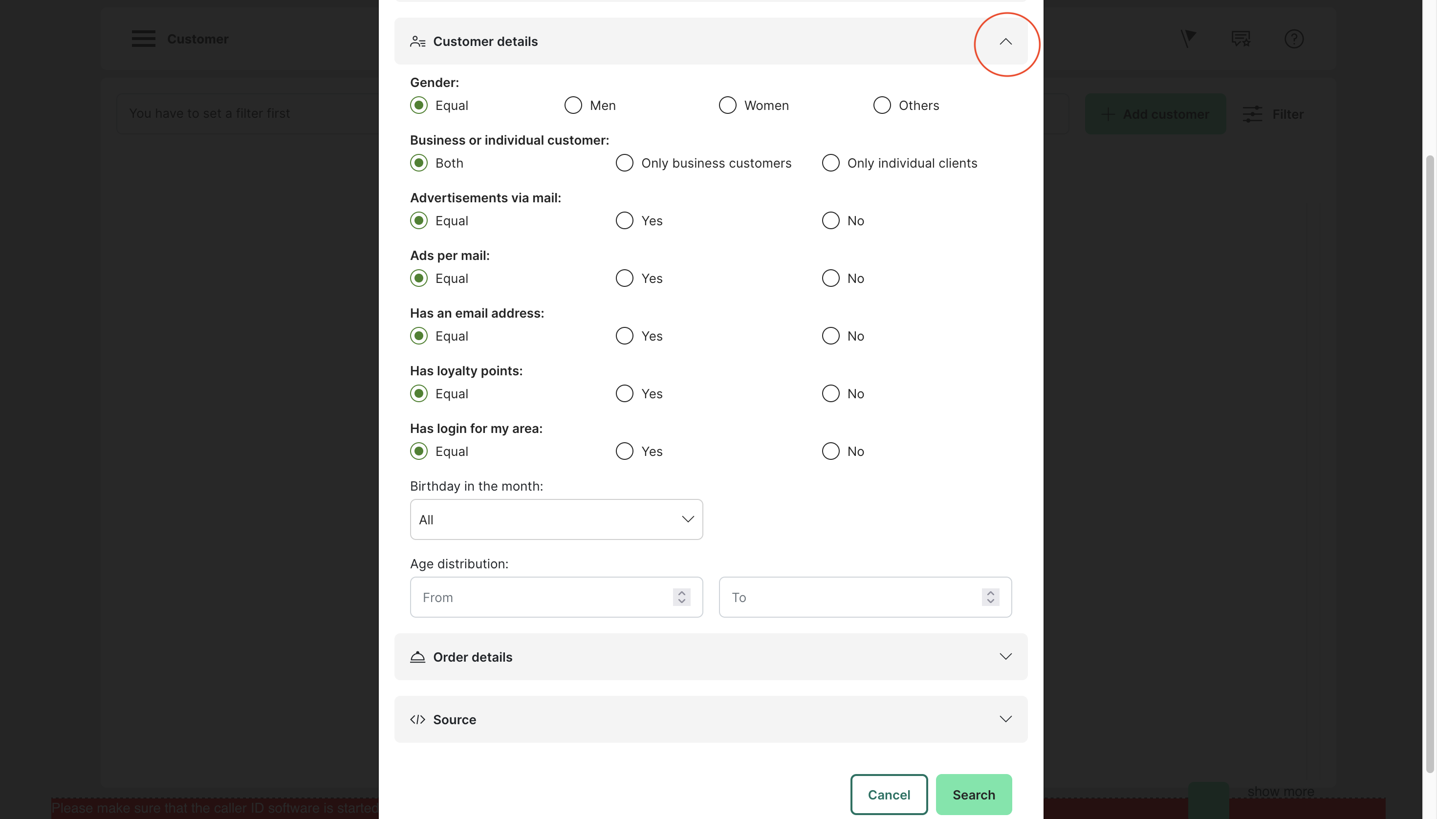 Customer search filters