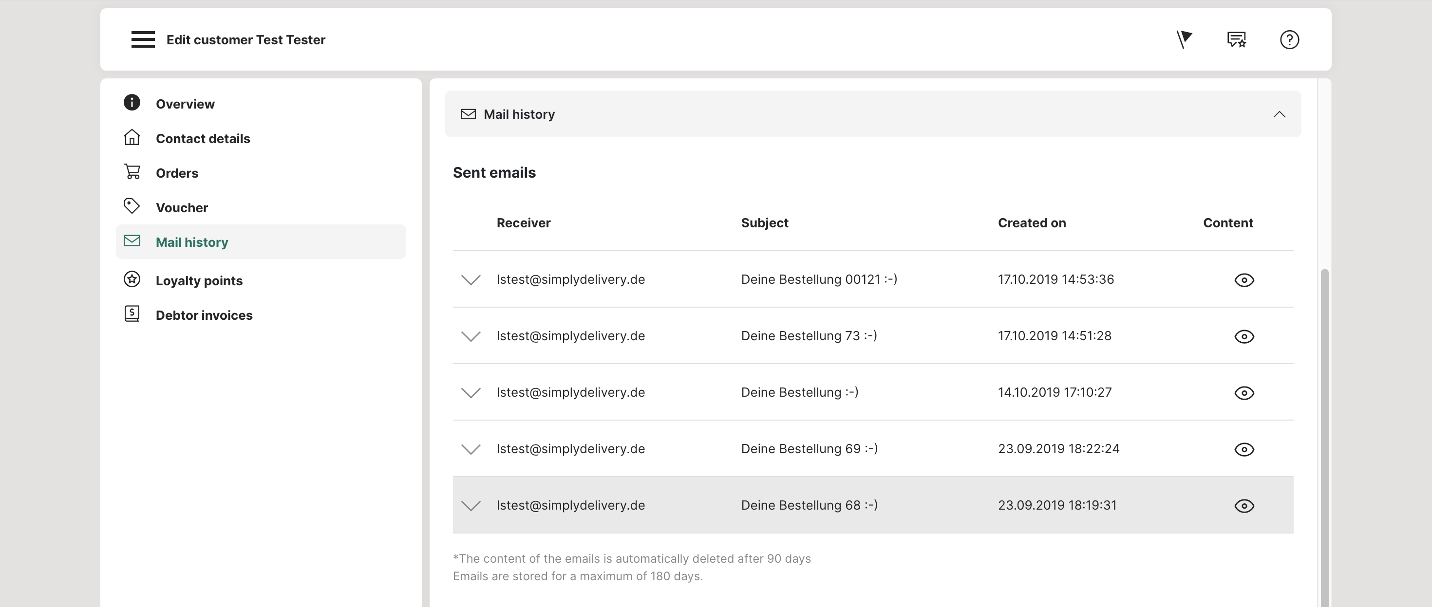 In the e-mail overview, all e-mails that have been automatically sent to a customer are registered. This allows you to check whether, for example, complaint discounts or order confirmations have been sent.