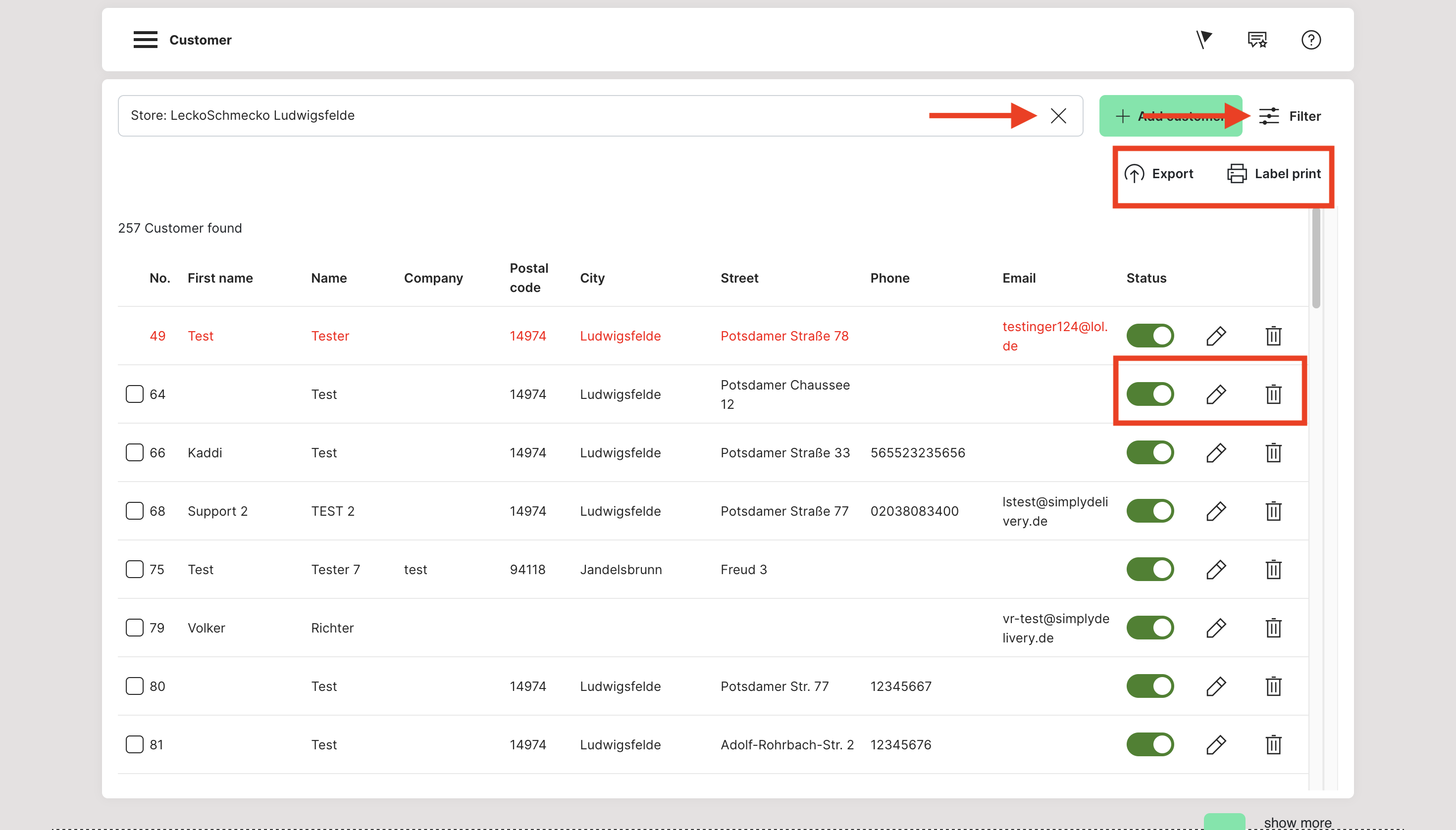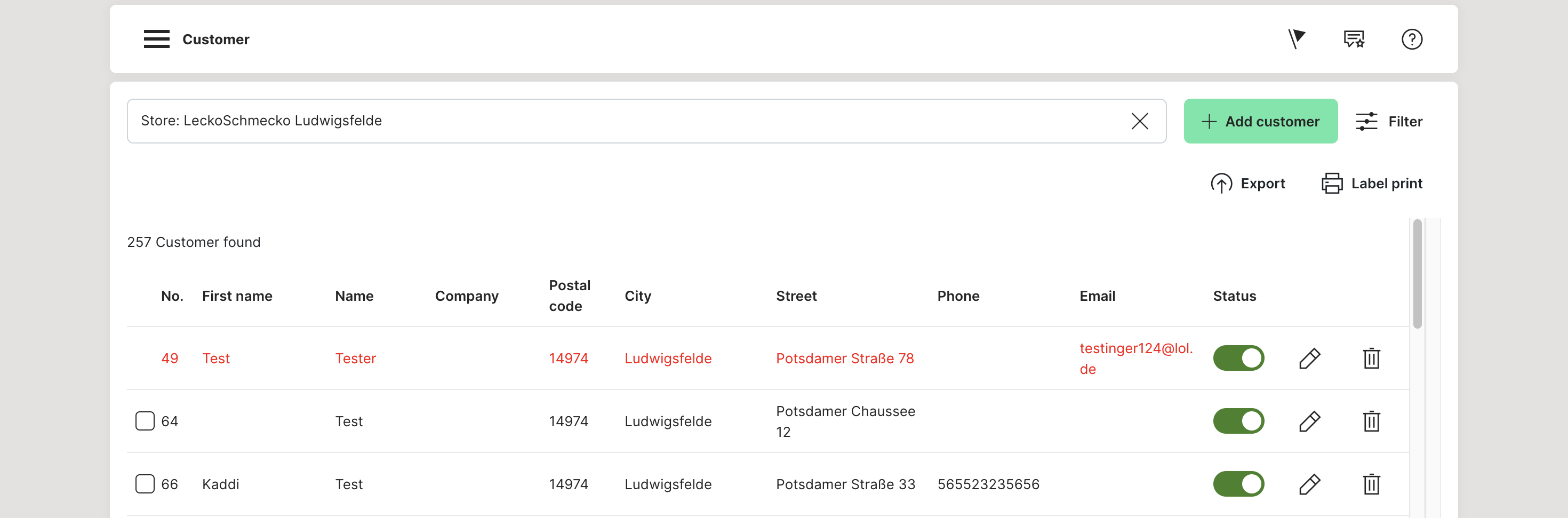The green button "BACK" in each case at the bottom left takes you back to the filterable customer list.