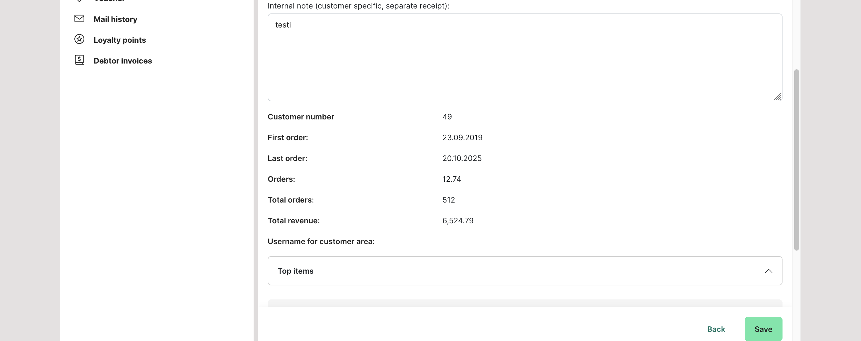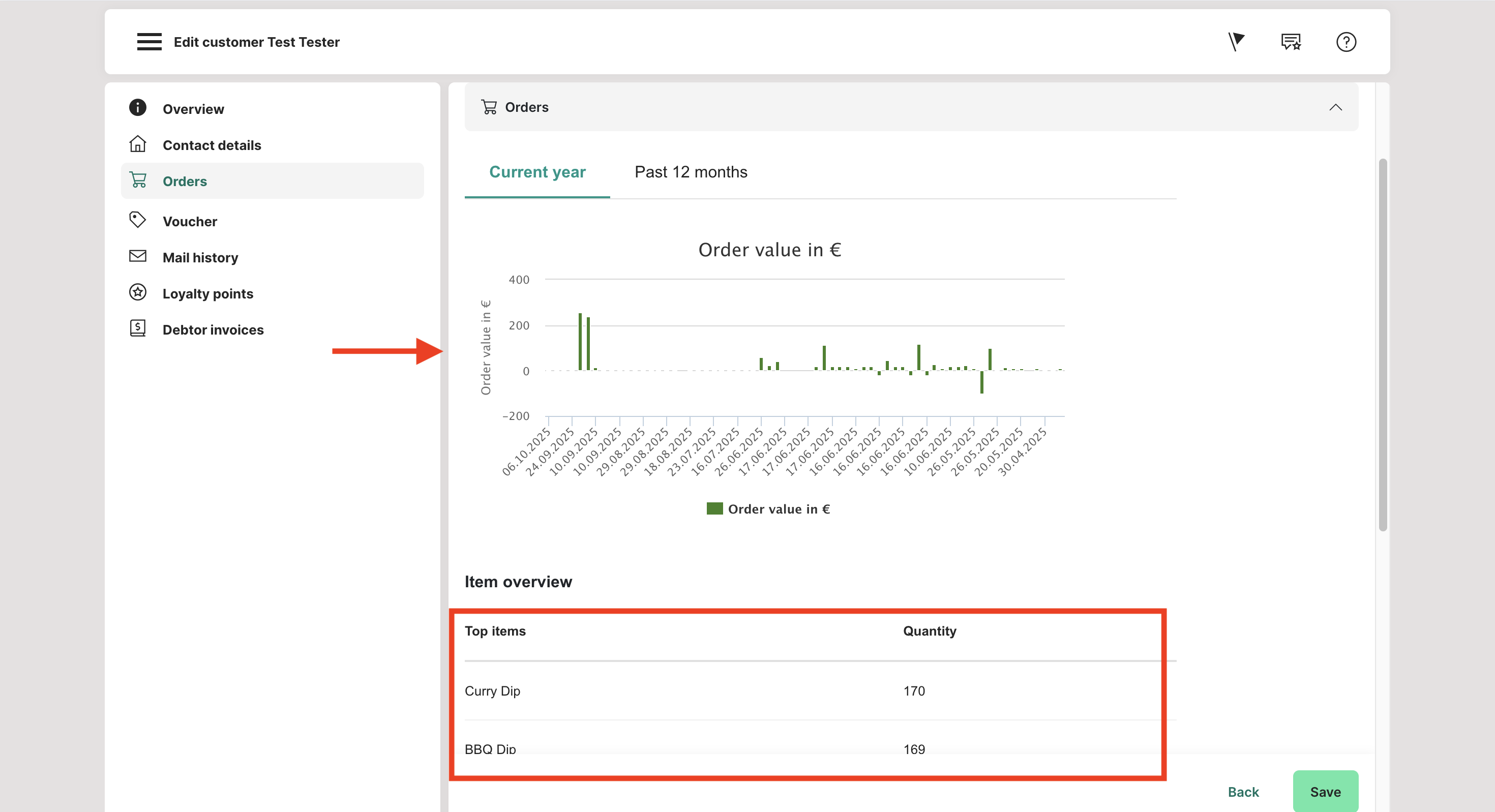 Here you get an overview of the orders that the customer has placed in the past. You can choose between the total history, the current year and the last 12 months. You will also find an overview of the top 5 items that the customer has ordered in the past. This is helpful if you want to send a voucher with a free item to a regular customer or deposit it with him.