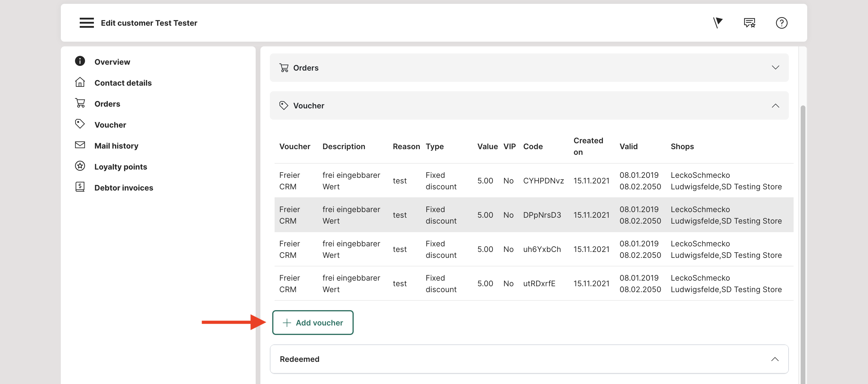 In this view you get an overview of the given discounts (CRM) of a customer. You can also add further discounts. Via the drop-down menu below the current vouchers, you can also see already redeemed vouchers. This is helpful, for example, to ensure that coupons have already been redeemed in case of complaints.