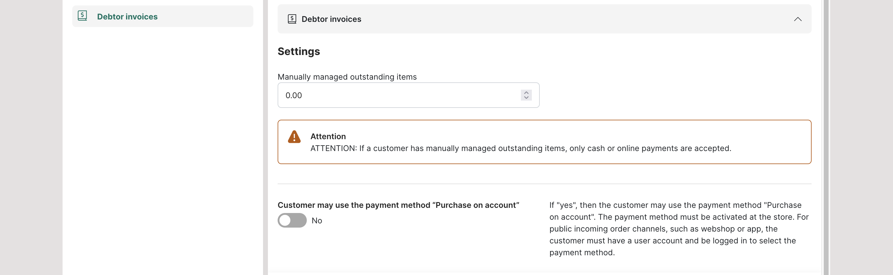 In order for a customer to be able to make purchases on account in all stores that have activated this payment method, provided they are logged into their account in the web shop/app, the option "Customer can use the payment method "Invoice payment" must be activated and saved on the "Debtor invoices" tab. As soon as the customer completes an order with this payment method, it is displayed in red in the customer list. Also, if it is blocked or if you enter a value for manually managed open items at the top of this tab.