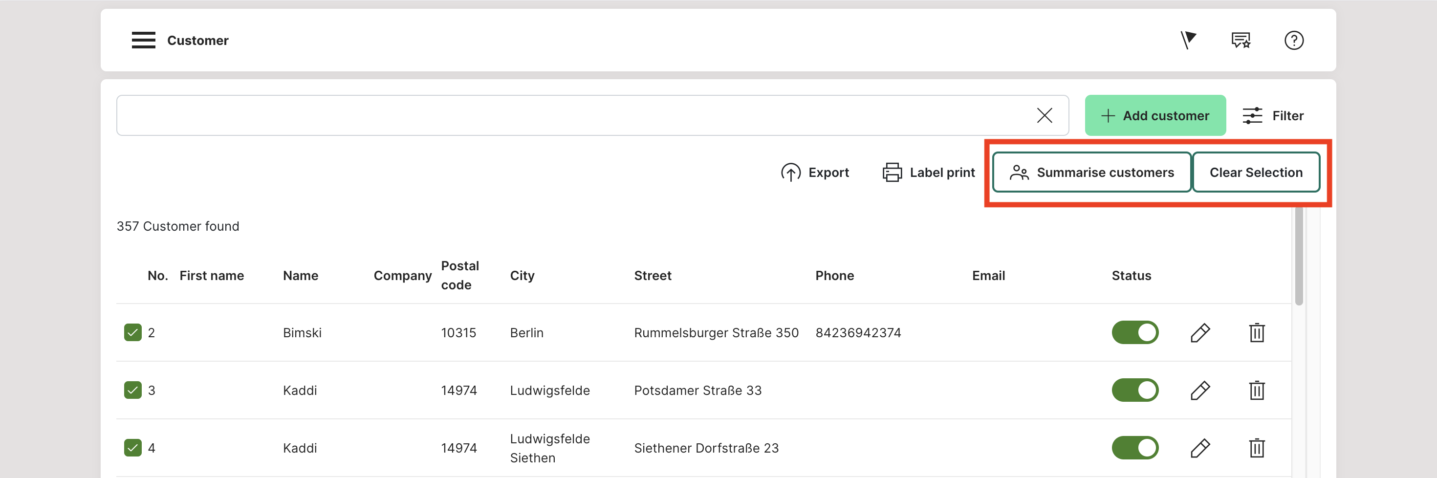 Via the display of the customer list you have the possibility to merge several customer masters into one. By clicking on the checkboxes next to the customer list entries in the main overview, which only appear for certain customers, you can select them. After 2 or more customers have been selected in this way, the orange "MERGE CUSTOMERS" button with a "paperclip icon" to the left of it will appear at the bottom left of the page below the list. Once you have pressed the button for merging, you can choose in an overview between the two accounts which one should be taken over. You can decide this, for example, depending on the customer number that is to remain at the end. In the next field you can then decide which addresses should be taken over and which of the addresses should be the default address. In the third and last field you can still decide which telephone numbers and mail addresses should be taken over.