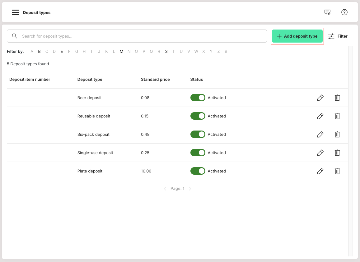 - Go to Admin: Item management > Deposit types.