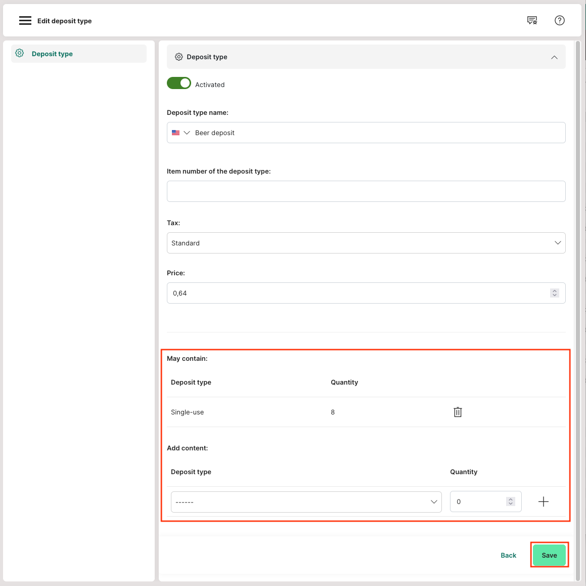 - Enter the deposit price per unit, e.g., "0.25" for €0.25 per bottle.