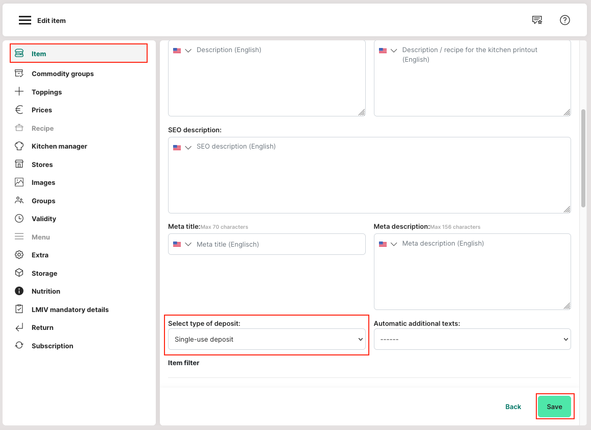 Deposit types are used to centrally define deposit prices and then assign them to items. For example, you can create the corresponding deposit for beverages.