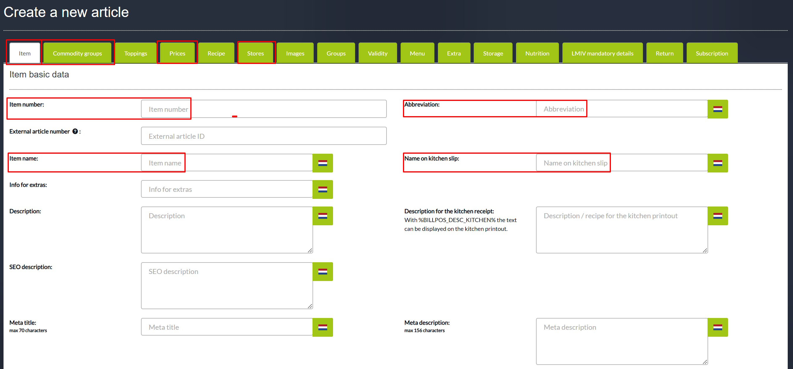 - Fill in the fields: Item number, Item name, Abbreviation, Kitchen label, Sales item, Product group, Price.