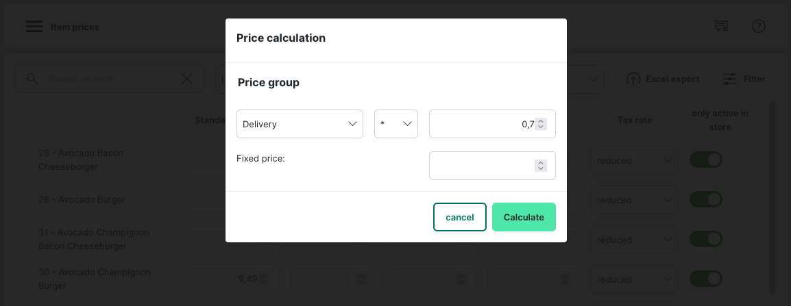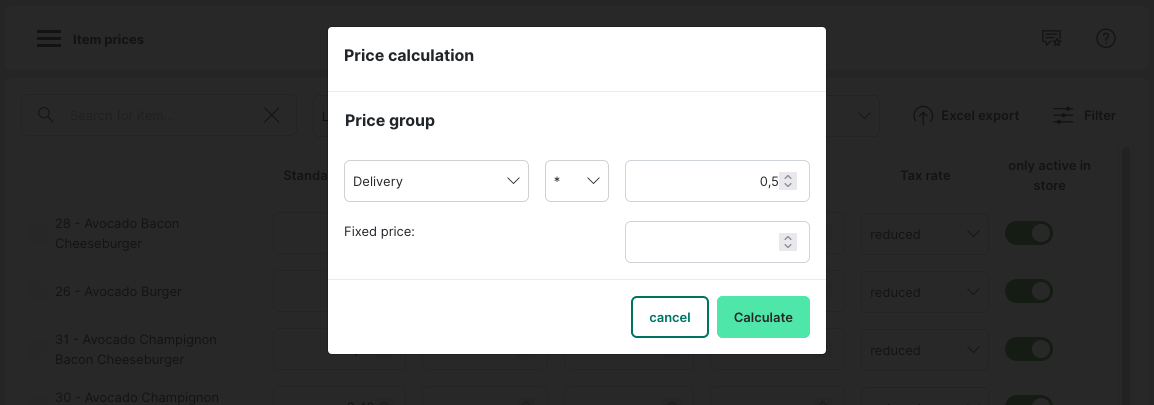 Instead of a percentage calculation, a "Fixed price" can also be set here for all items, e.g. € 5, in which case € 5 is entered in the entire column.