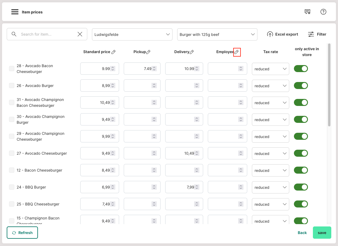 Before starting price maintenance (or if the item price groups do not yet exist), it is necessary to create the "Pricing categories" (e.g. employee, delivery, pickup) so that they are visible in the item prices.
